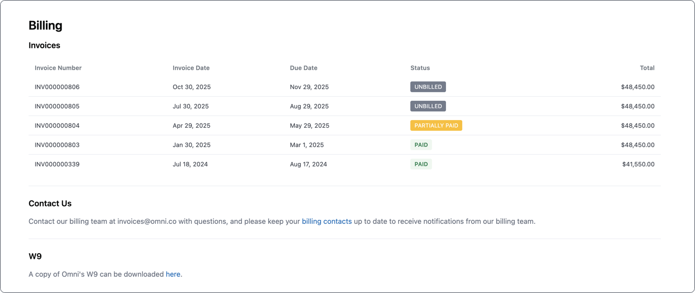 The Settings > General > Billing tab allows you to view billing-related information for your organization, including past invoices and Omni's W9.