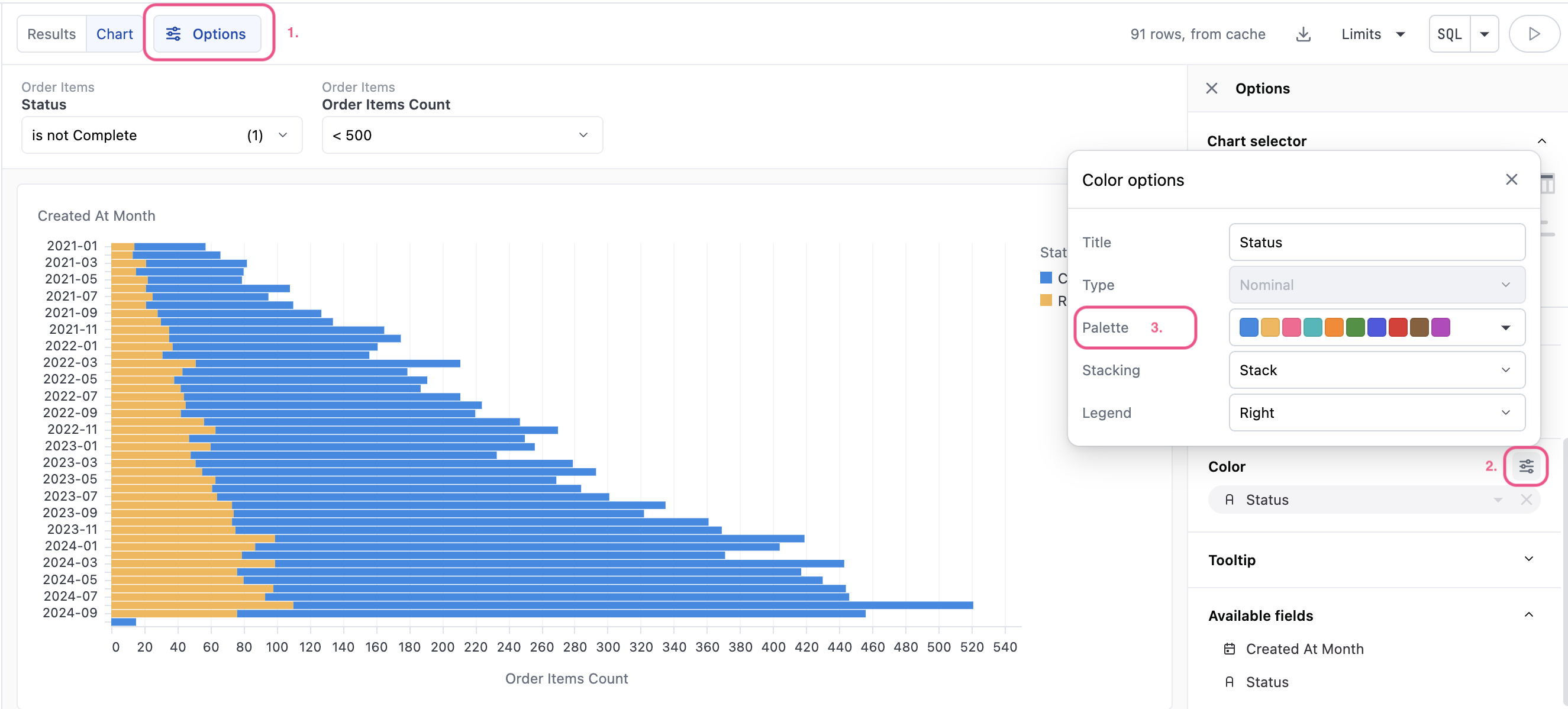 For more on using palettes in visualizations, see the Color by / Stacking documentation.