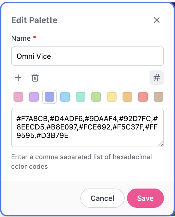 To modify a custom palette, click the Options icon next to the palette and select Edit. Make your modifications and click Save. Existing charts using the palette will be updated with the modifications.