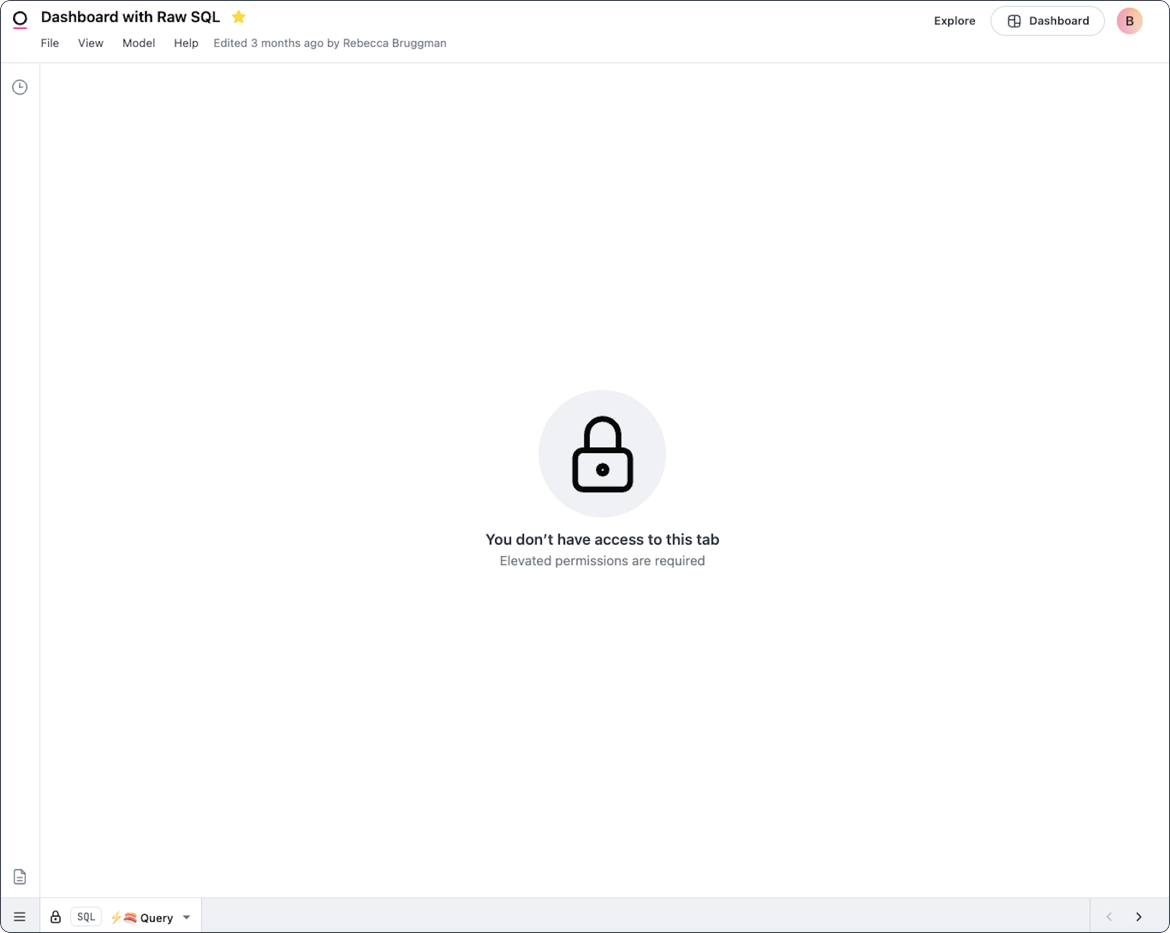 How to fix it | To resolve the error, the query associated with the tab must be rebuilt using a topic. Omni's AccessBoost feature can be enabled, which would ignore data permissions usually enforced by connection roles, but this would only show the data on the dashboard not the query in the workbook. |
