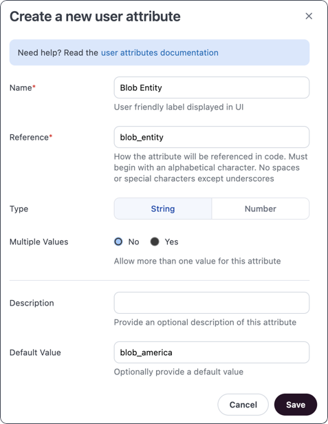 urn:omni:params:1.0:UserAttribute:blob_entityattribute, you'durn:omni:params:1.0:UserAttribute:blob_entity. - Type - Select the type of the attribute you created in Omni: