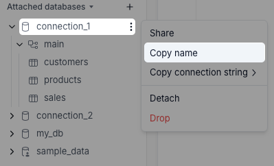 You can copy the name of the database in MotherDuck by clicking the three dots next to the database, then Copy name: