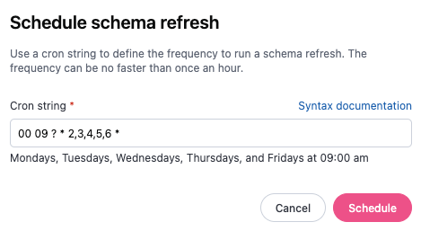 Alternatively, you can use the Schedule button to define a cron schedule to refresh the schema. For example, if you know your ETL pipeline runs every day at the same time, you could define a schedule that refreshes the schema after the process completes to ensure your data is always up-to-date.