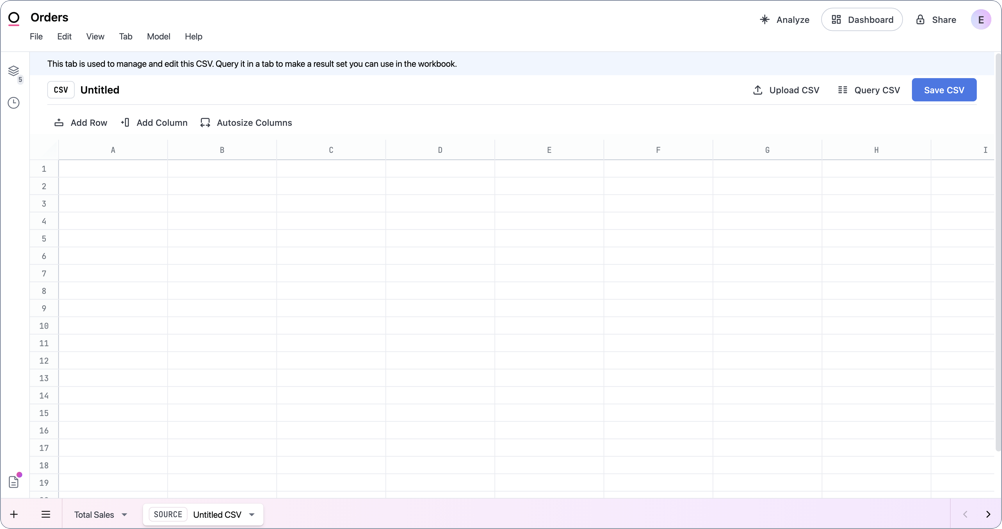 Sometimes you may want to utilize data in an analysis that isn't in one of your database connections, whether it's for data enrichment or an initial exploration. Creating a data input table allows you to add data to Omni, whether by manually entering data or uploading a CSV or XLSX, without needing to touch your data pipelines.