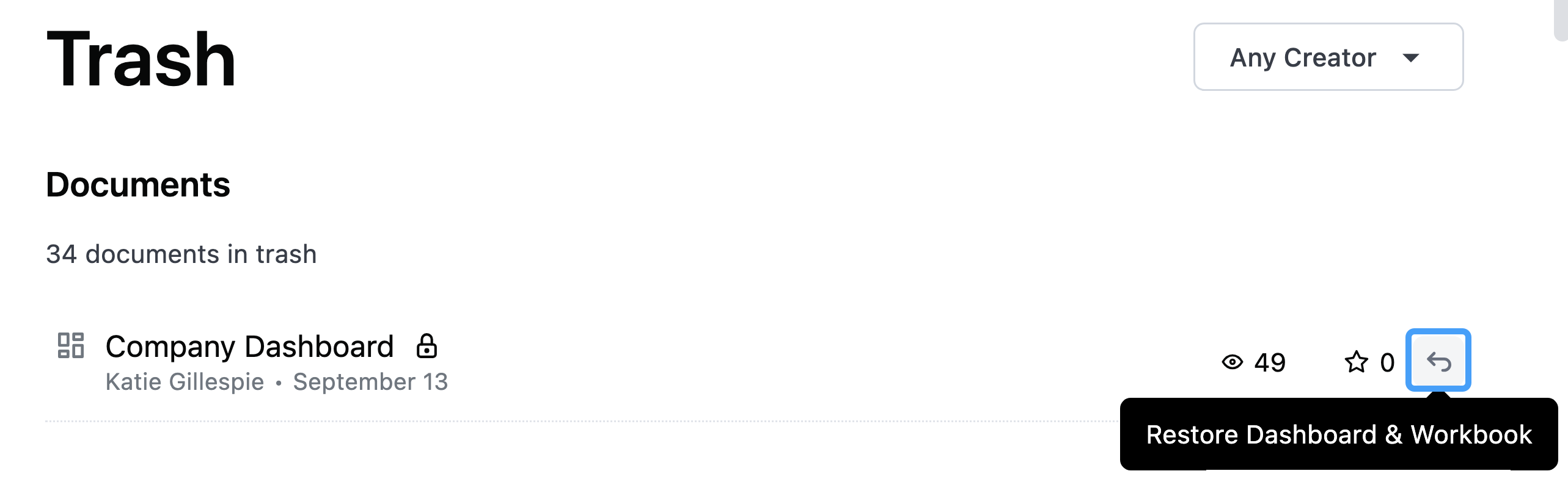 Trash - All of the discarded content for your Omni instance. Items in the trash are never discarded.