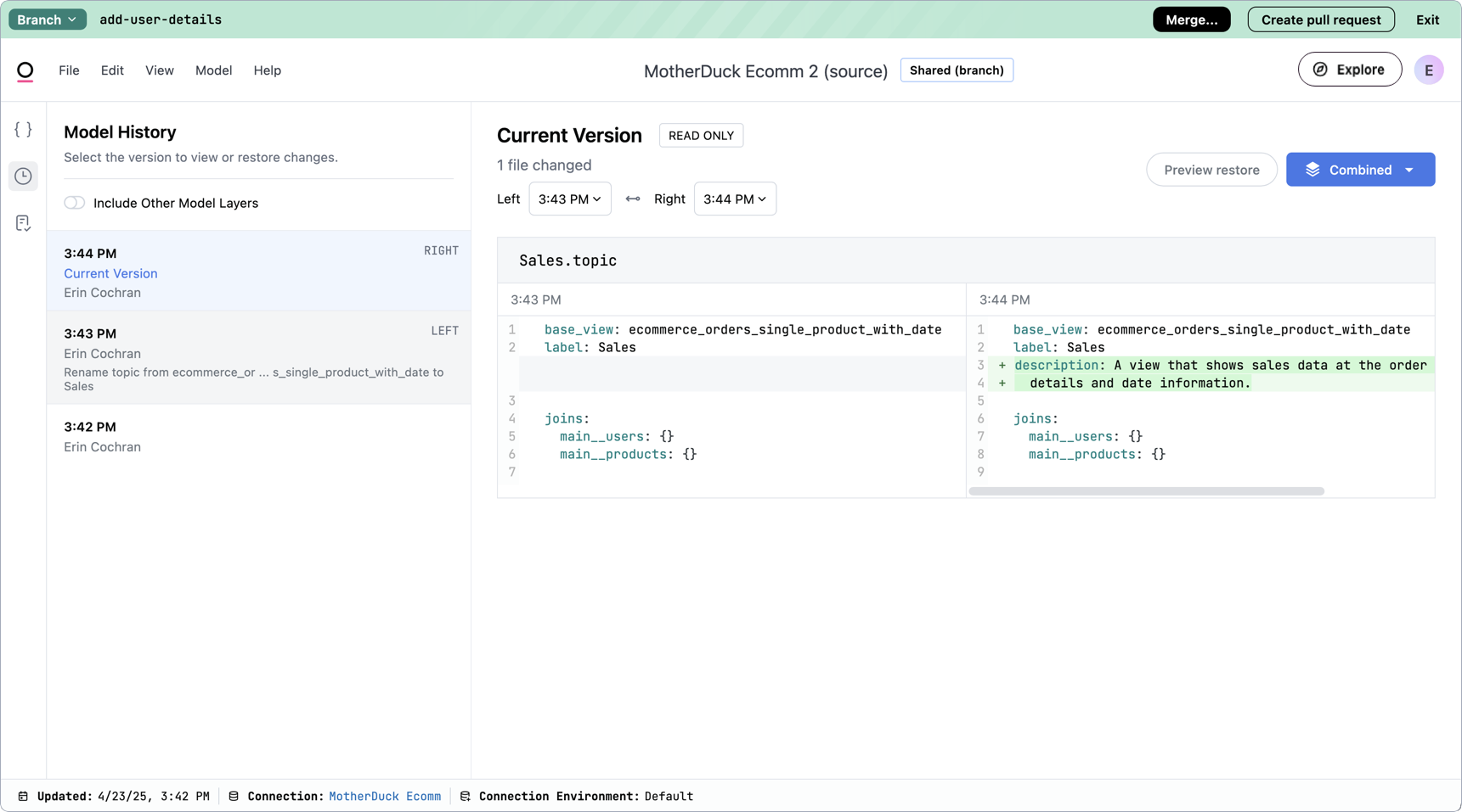 Each time you save a change in the IDE, an entry will be added to the Model history panel. Open this panel to view the changes currently on the branch, as well as the before and after (also called a diff) of each change: