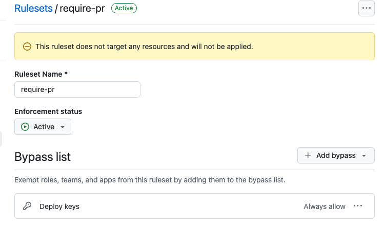 - In the git repo's settings add a Github ruleset to require pull requests. Select the the rules