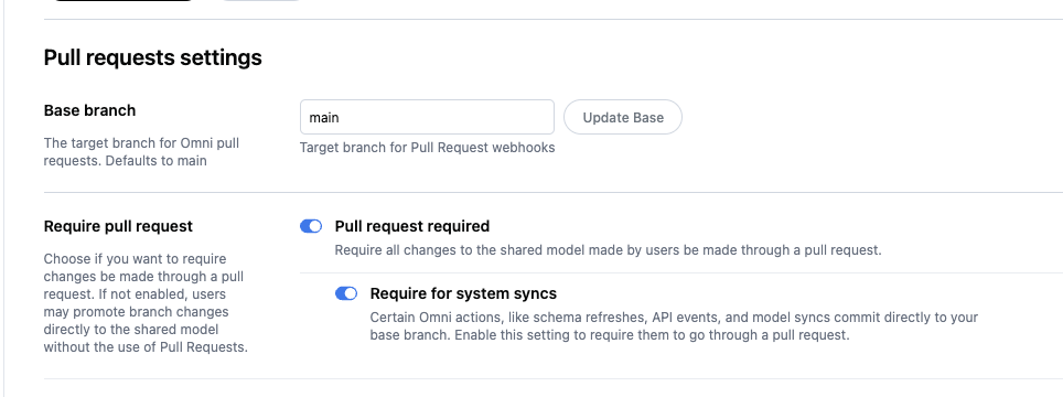 - Require Omni to go through the pull request process for all schema refreshe by turning on Require system syncs as in the below screenshot.