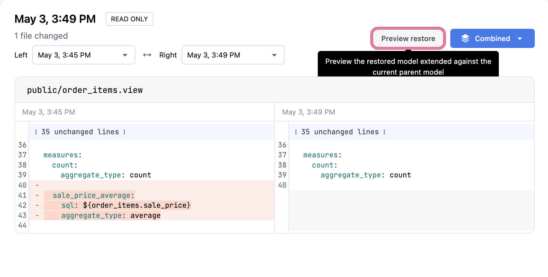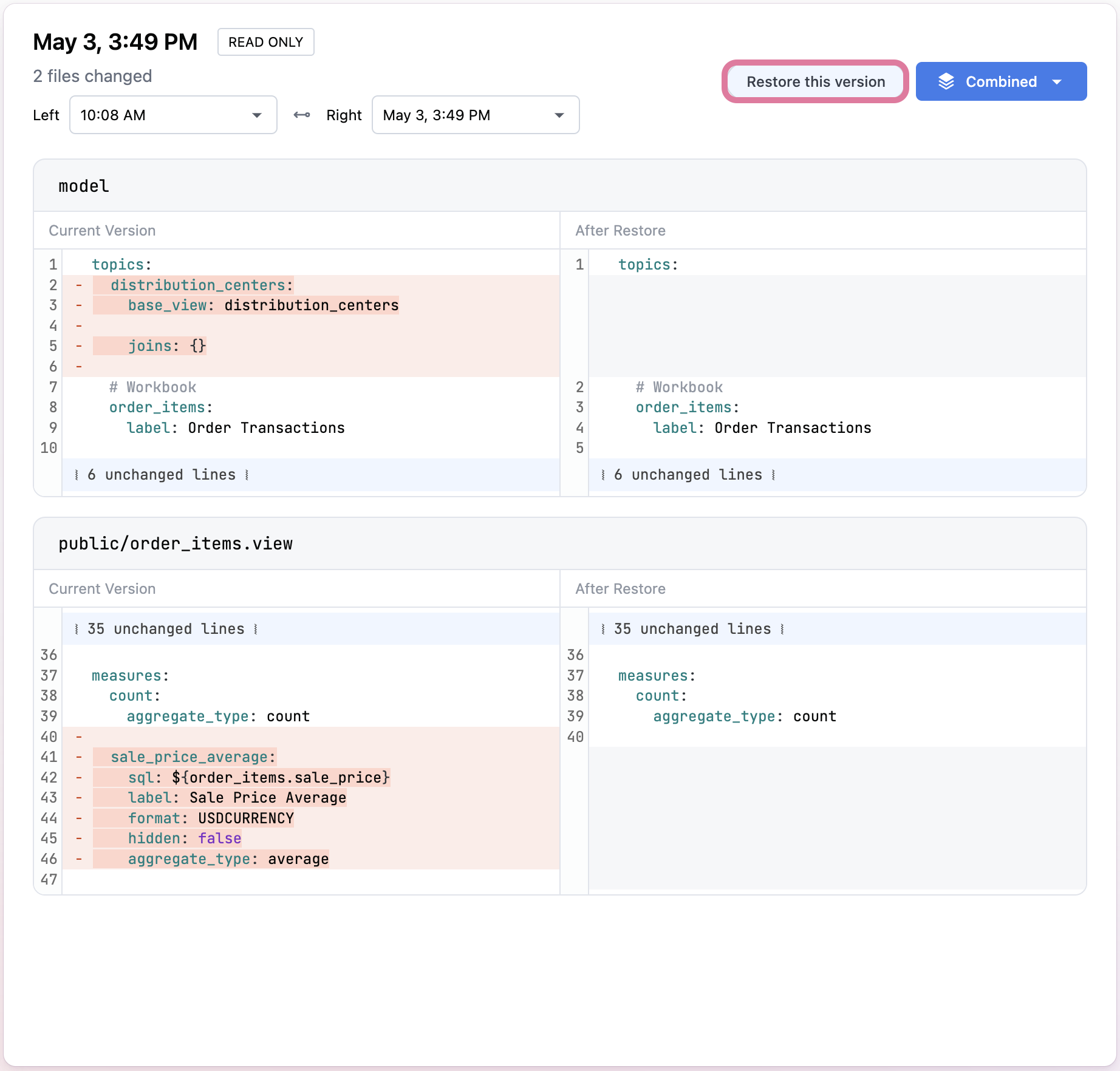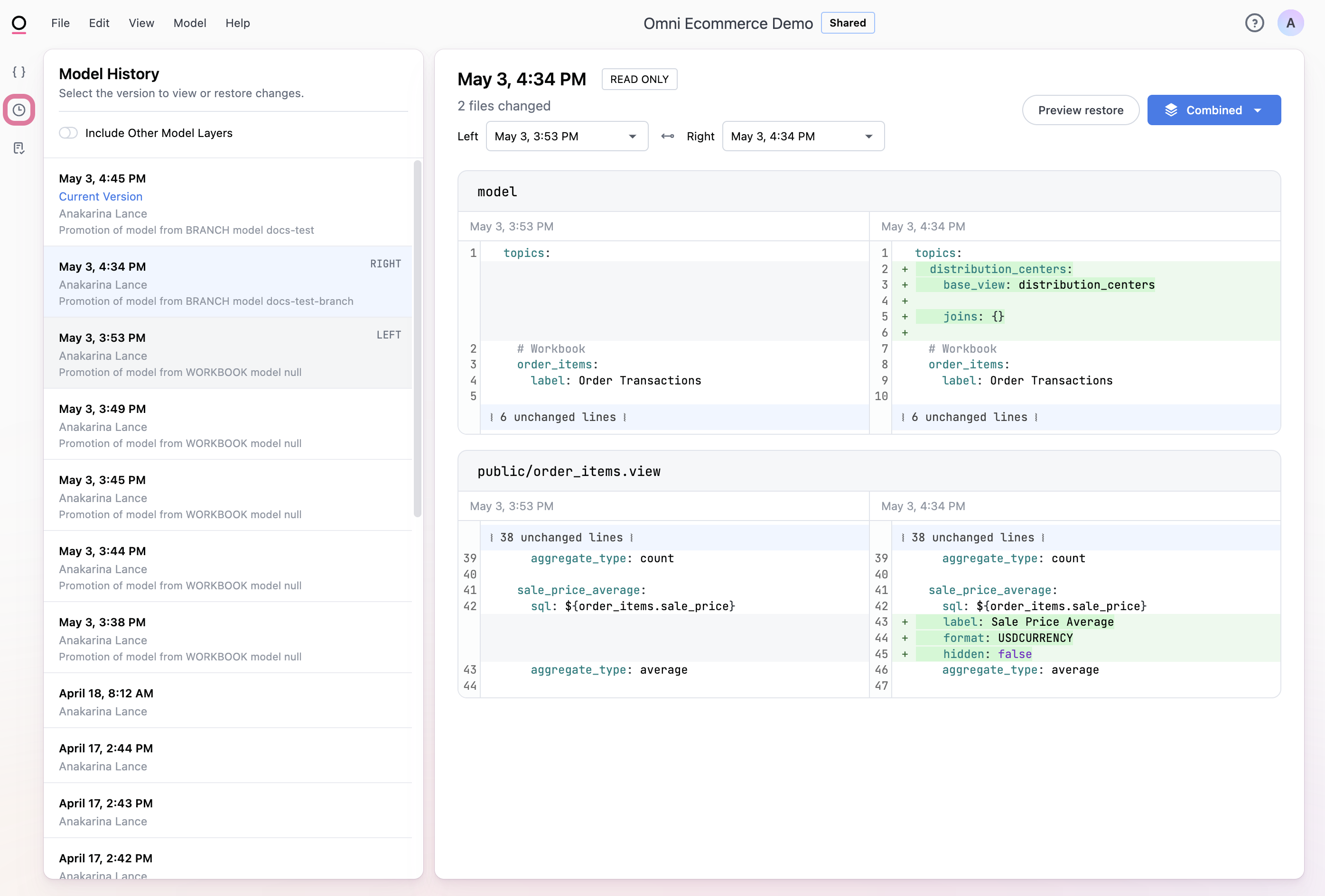 Restore a previously saved version of your model files by navigating to the change you want to restore to.