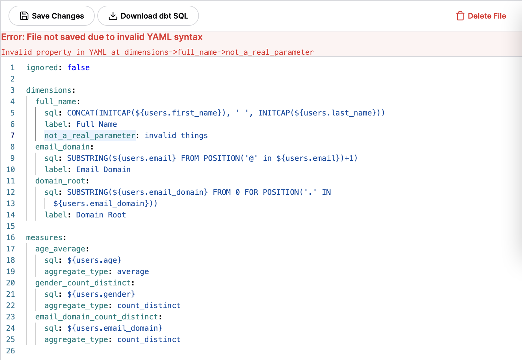 Omni models have strong validation. Errors in YAML syntax or property names are rejected without being saved. This will be softened over time and the UX will be improved, but be aware that invalid code may be rejected on save in the data model.