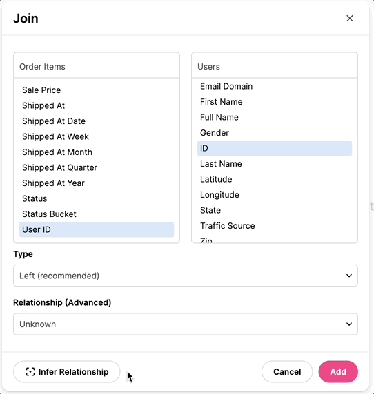 - In order to count across tables correctly, enter the relationship between the tables. To make this easier we have added an inferrer that checks cardinality between data sets and will select for you (see below)
