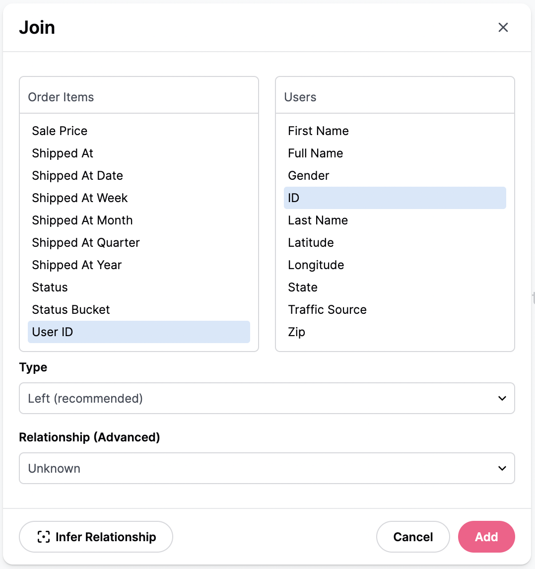 - Select fields from each side of the join using the dropdowns