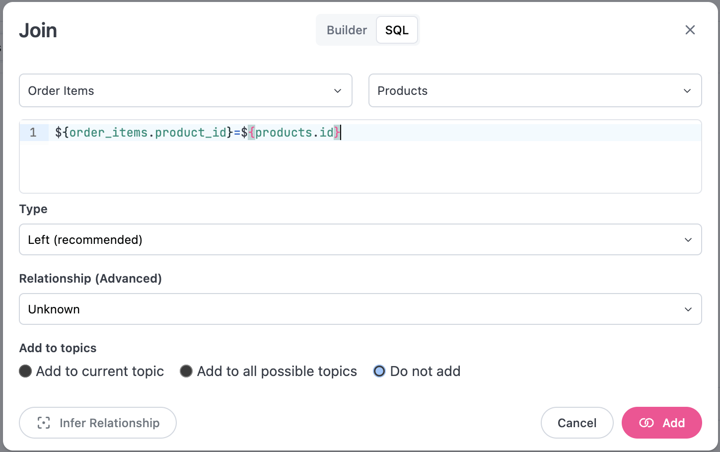 Global relationships are available for use across any topic. These are usually the best place for a relationship because they mean the join will be reusable in many places. A simple example might be joining products to orders on products.id = orders.product_id.