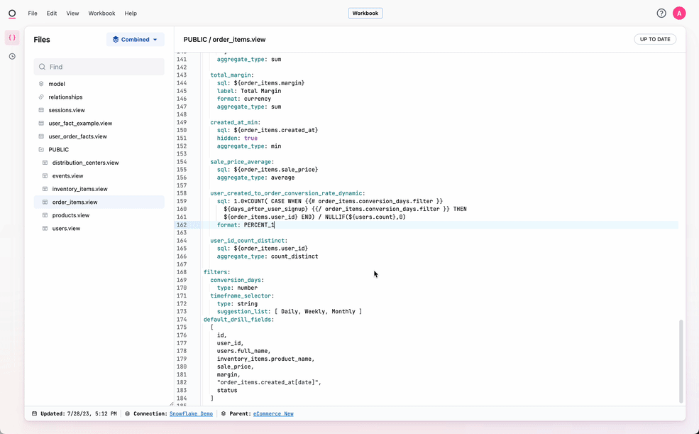 Note: Any YAML param that expects a string must be wrapped in double quotes if the leading character has special meaning in yaml. i.e. sql: {{ view.field_name.filter }} would need to be sql: "{{ view.field_name.filter }}" to avoid validation errors.