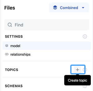 In the Files panel of the modeling IDE, click the + button in the Topics section.