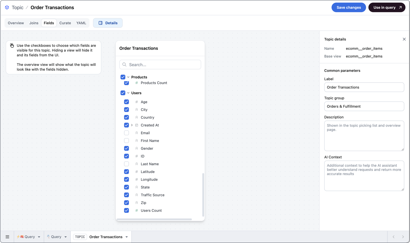 By default, all fields from the topic's base view and any joined views will be accessible in the topic. In this step, we'll show you how to curate the fields in the topic.
