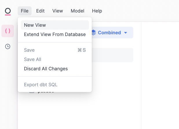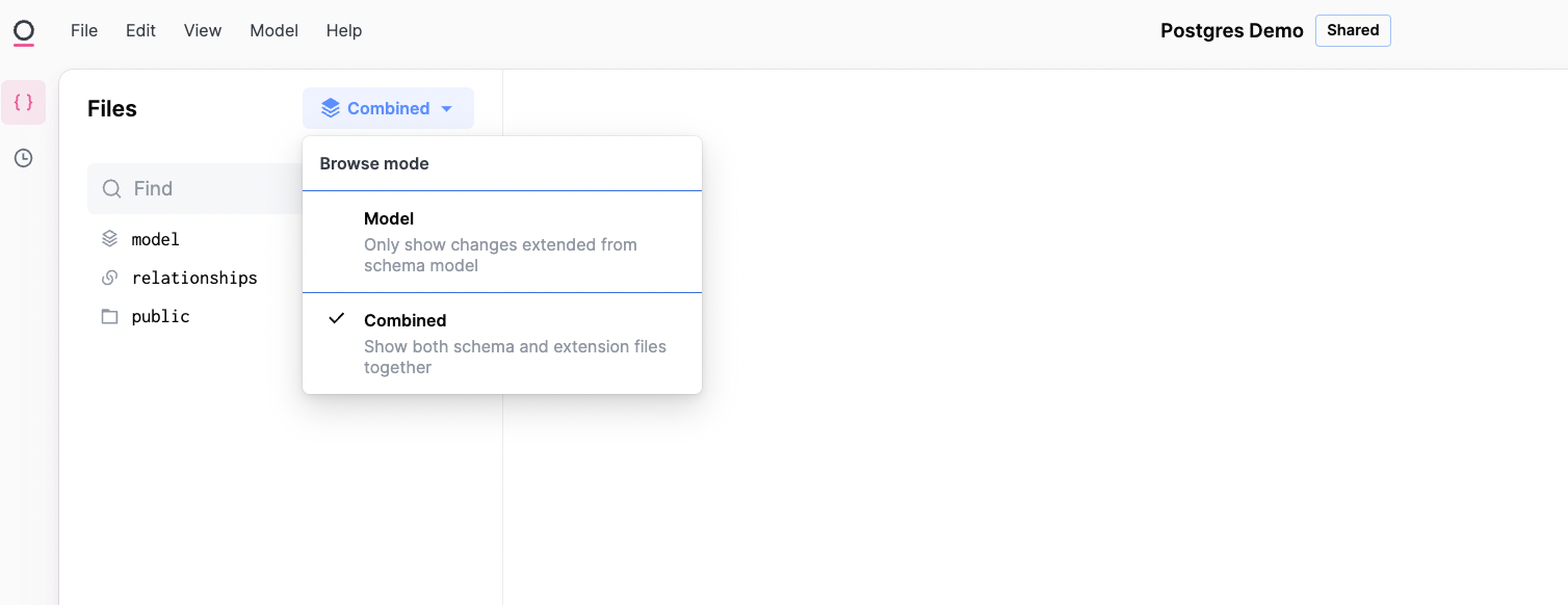 Additionally, modelers may toggle between user-defined fields in Omni, 'Model', or all fields including the untouched fields from the database schema, 'Combined'. Note that 'Model' and 'Combined' are relative to which model layer you are in. When you are viewing the Shared model, like the screenshot below, 'Model' refers to user defined fields in the Shared model. However, if you are in a Workbook model then 'Model' refers to the user-defined changes only for the workbook and does not include the user-defined fields in the Shared model or the untouched fields from the database schema: