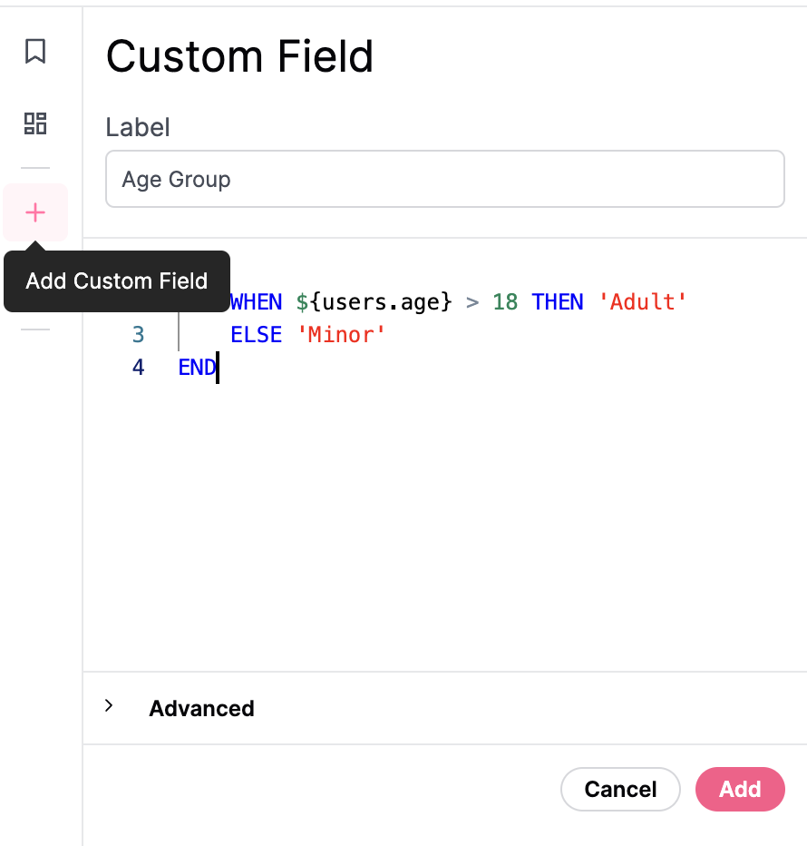 Most fields in the field picker come directly from your database schema. However, by using Custom Fields you can also create new ad-hoc dimensions and measures to define custom logic and calculations that can be reused.