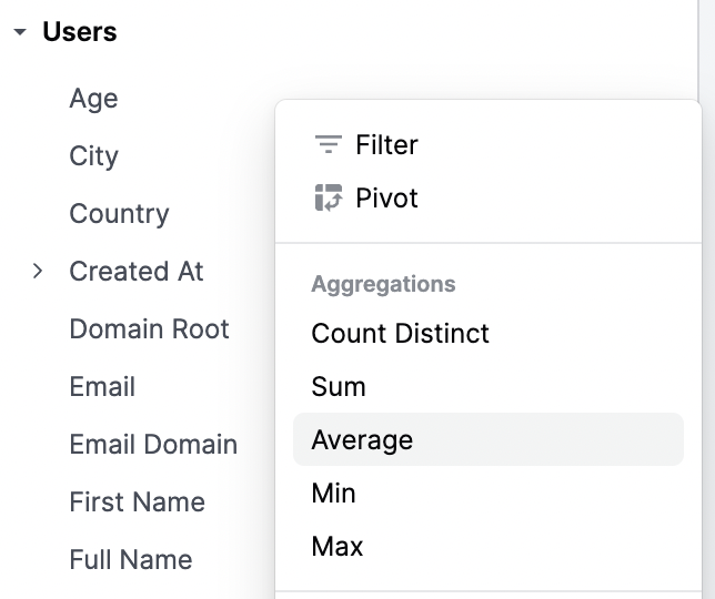 - Right click on any existing dimension and choose an aggregation (e.g. count distinct, sum, average, min, max). This will automatically create a new custom measure that appears in the field picker.