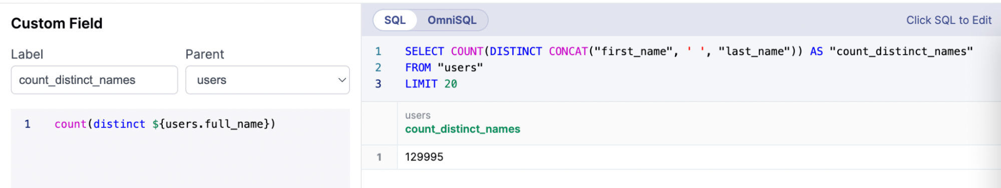 Note how this custom measure also references the previously created full_name custom field. That logic is 'chained' together when expressed in the generated SQL.