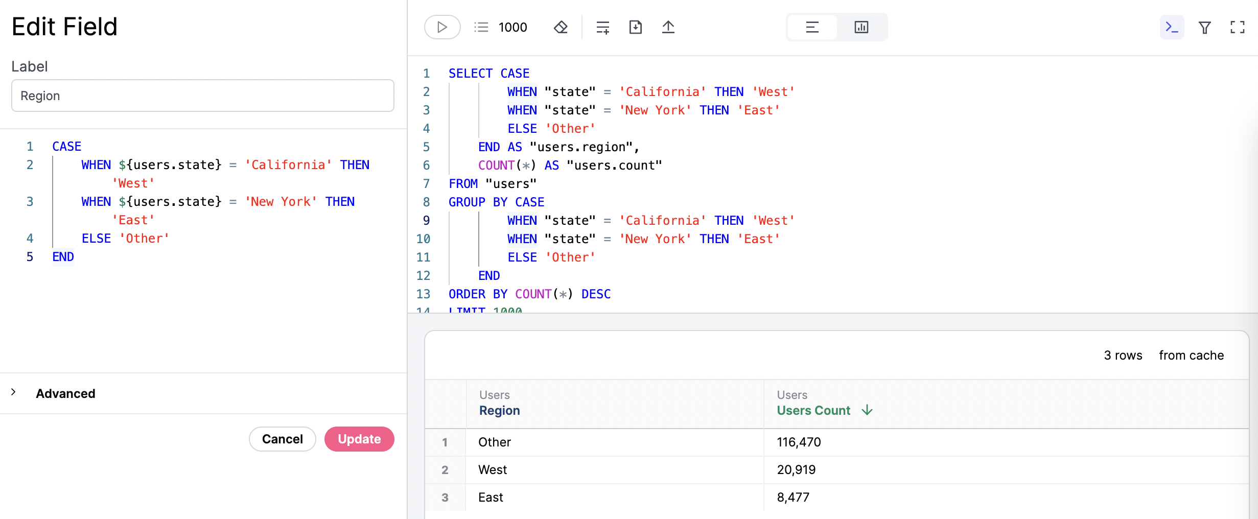 When you add the custom field to a query, you can see the logic applied in the SQL block.