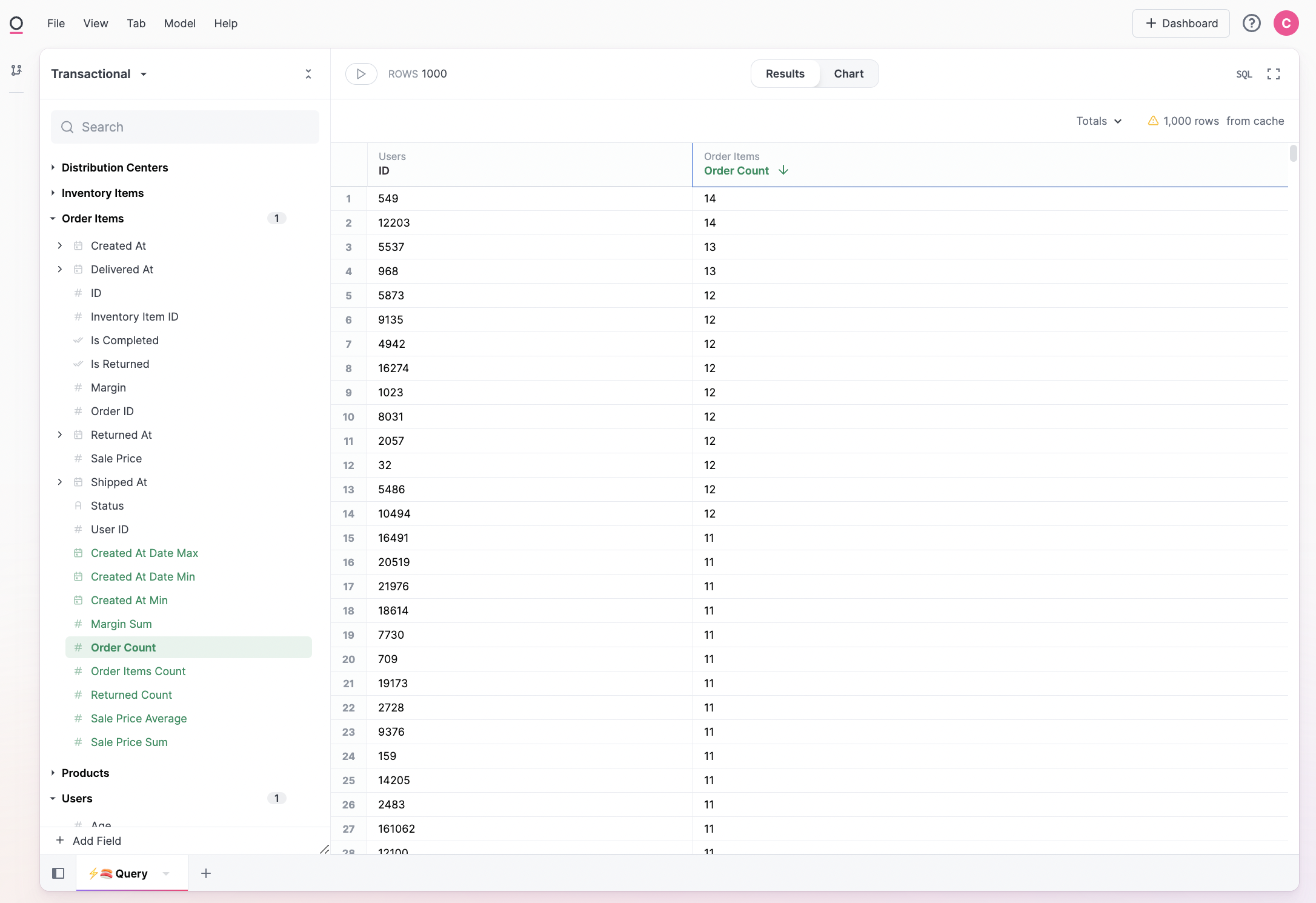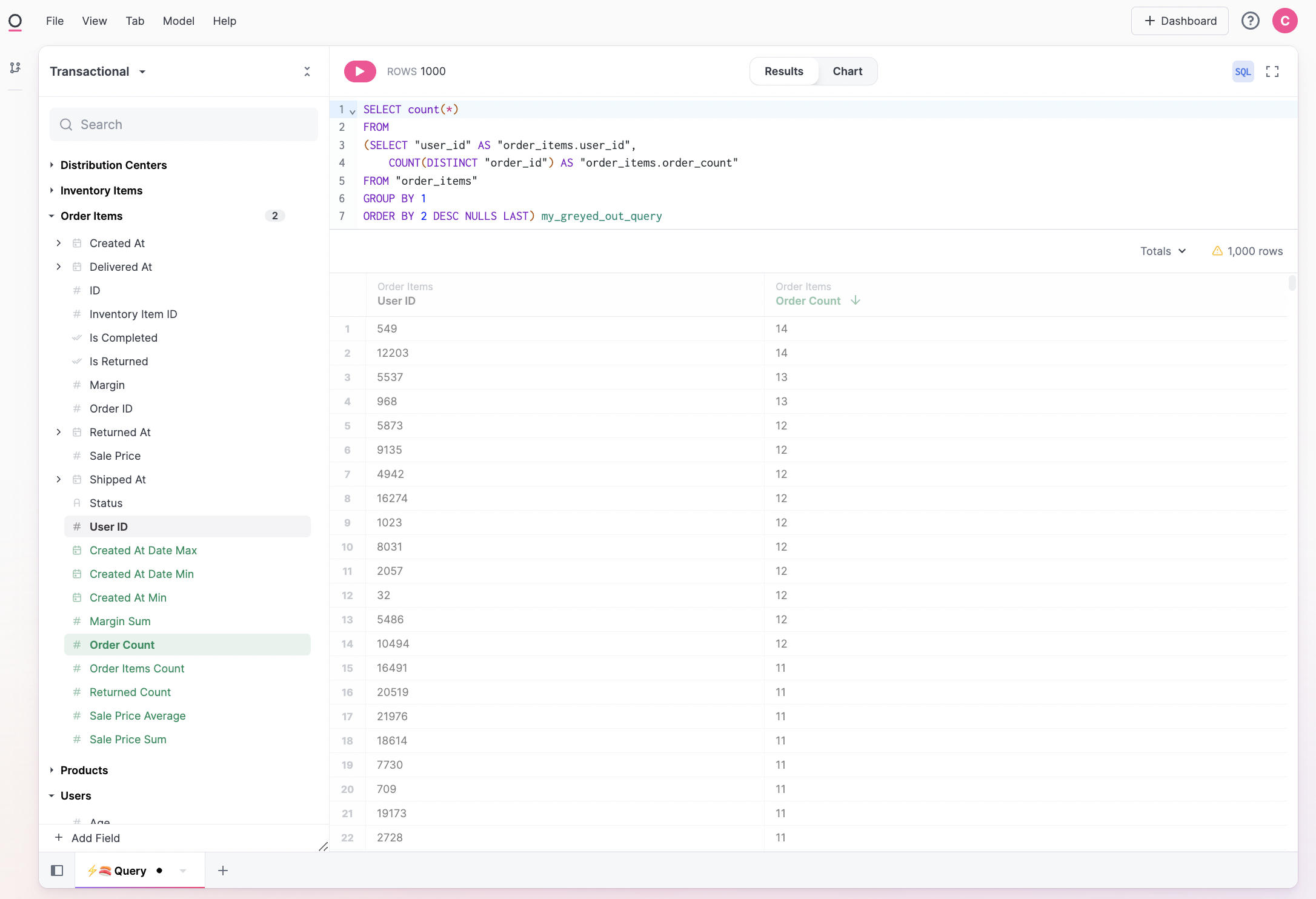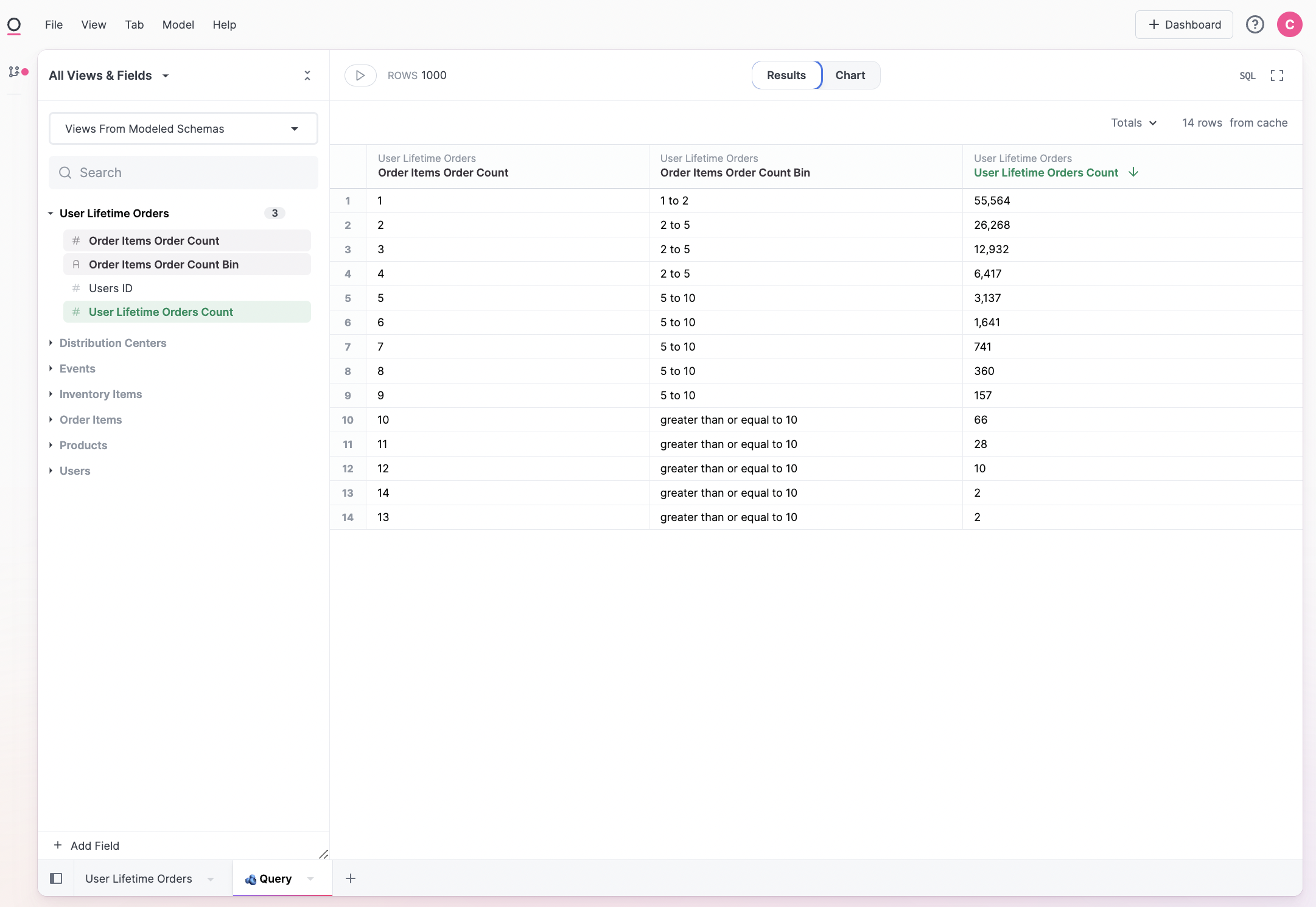 - Build baseline query where we want to analyze distribution. Here we'll look at lifetime orders per user: