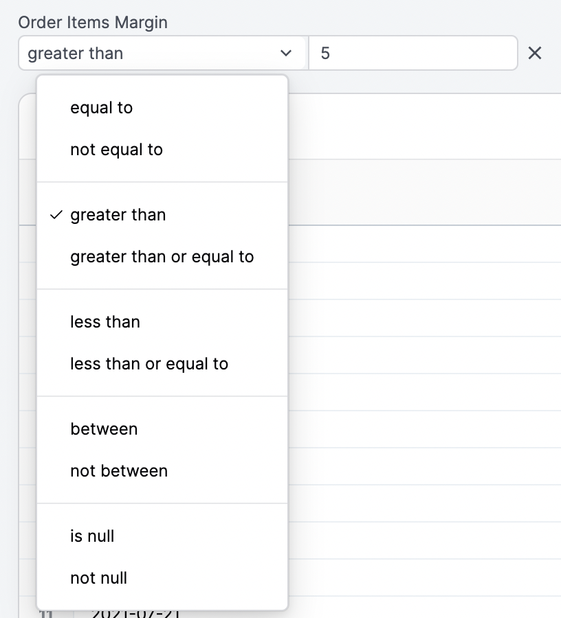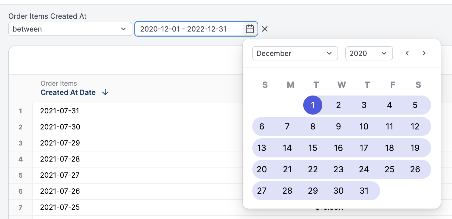 Each dimension can be added as a filter to focus on specific rows of data. Different filtering options will be presented for dates, numbers, and strings: