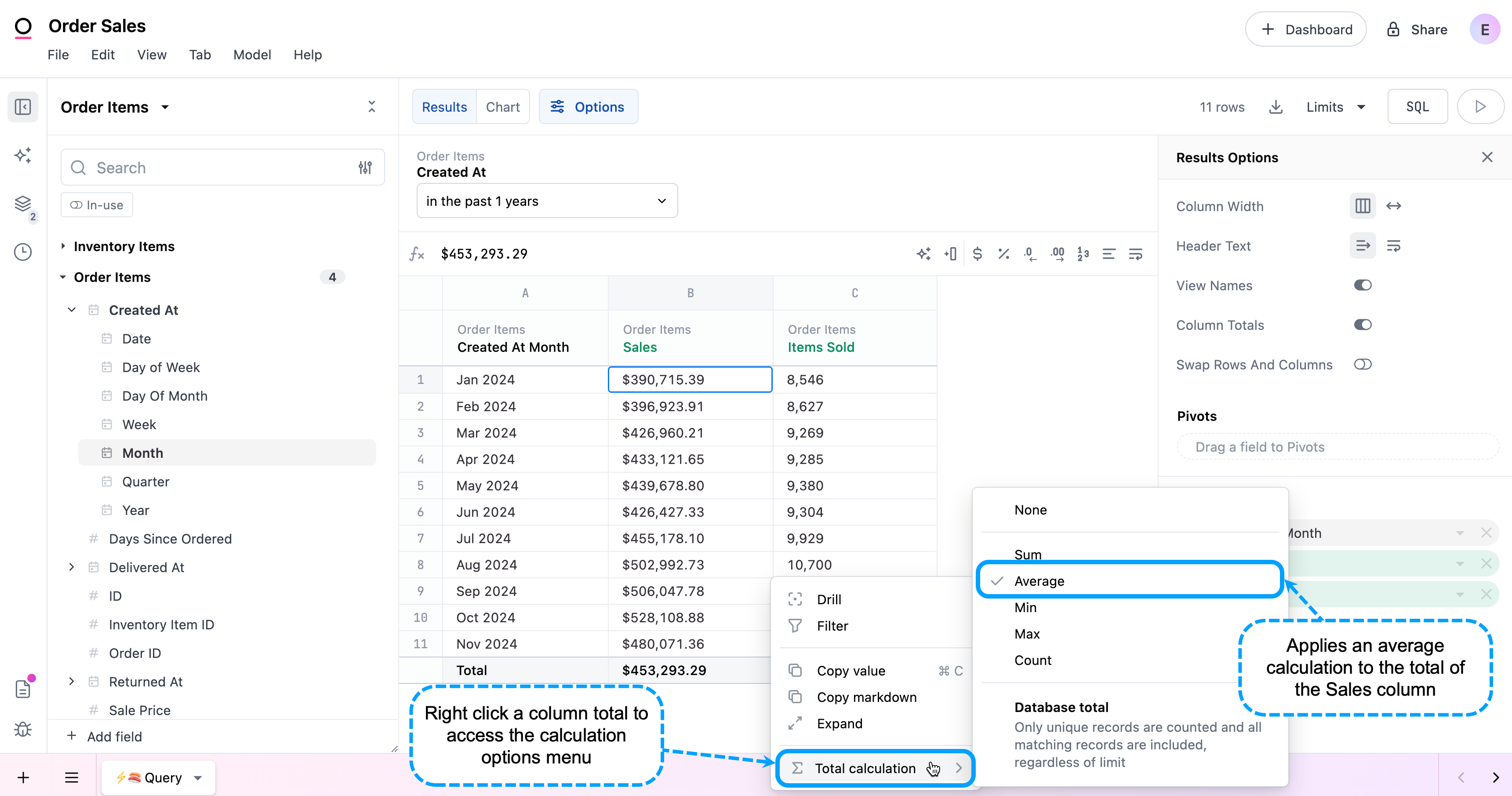 For example, you have a table that shows total sales by month for 2024. If you wanted to see the average sales across all months, you could change the Total calculation to Average: