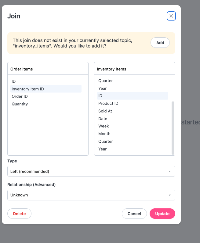 For existing joins that are not available in a topic, users will be prompted whether they want to add said join to the active topic.