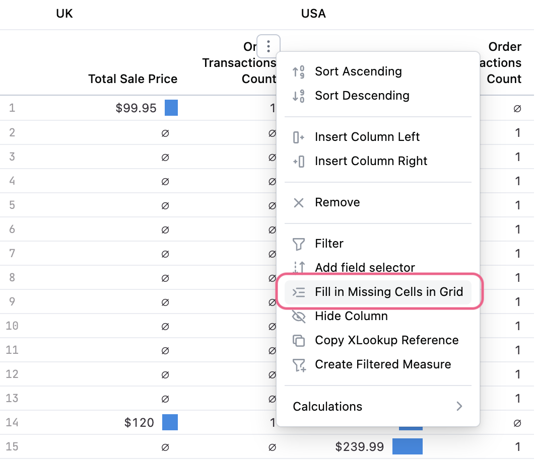 In addition to filling dimensions, it's often valuable to fill a pivoted table that contains nulls for 'more correct' reporting of aggregates. To replace nulls with 0s in the pivottable, simply select "Fill in Missing Cells in Grid" on a pivoted report: