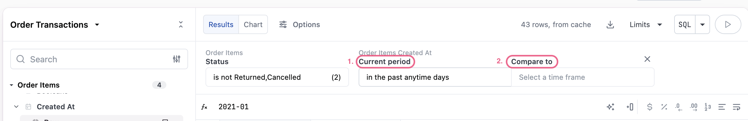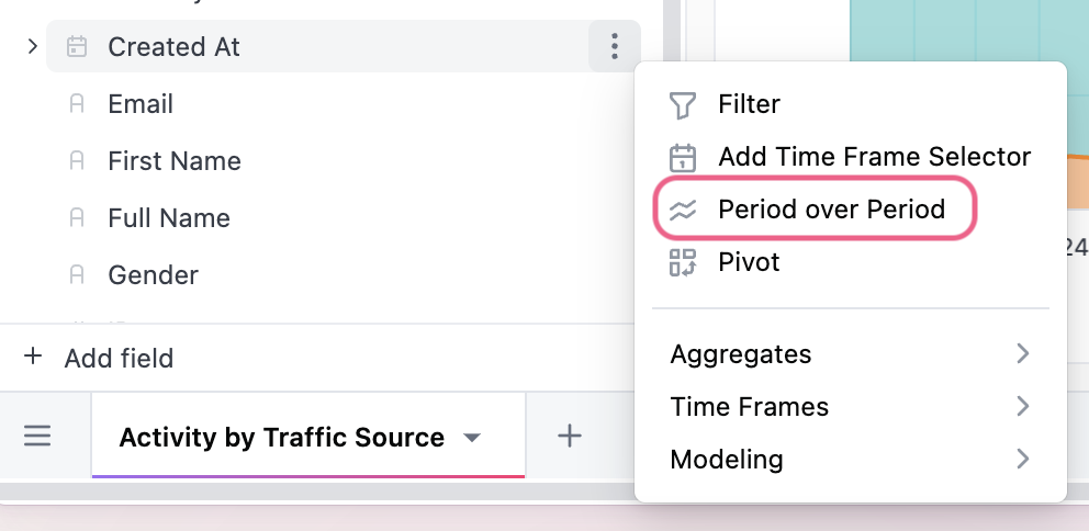 You can seamlessly create those time periods from the field picker by selecting ”Period over Period” from the three dot menu of the date dimension you want to use.