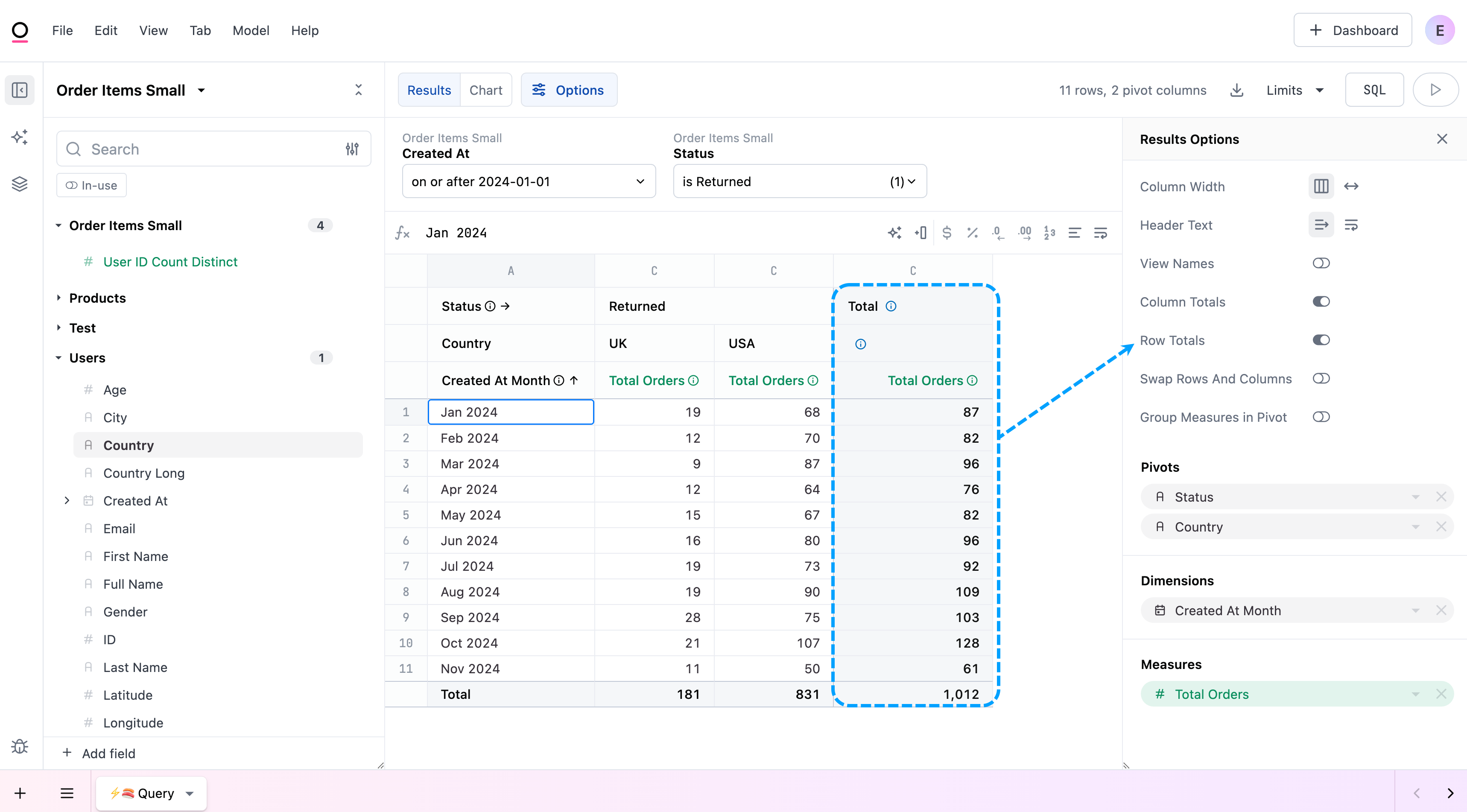 Enabling row totals adds a Total column to the right of the table. For example, you have products that are sold in the UK and USA. You want to view the total number of returned orders for each country by month, but you also want to calculate the total returns for the month. Creating a pivot table like the following and enabling Row totals will add a column containing this data: