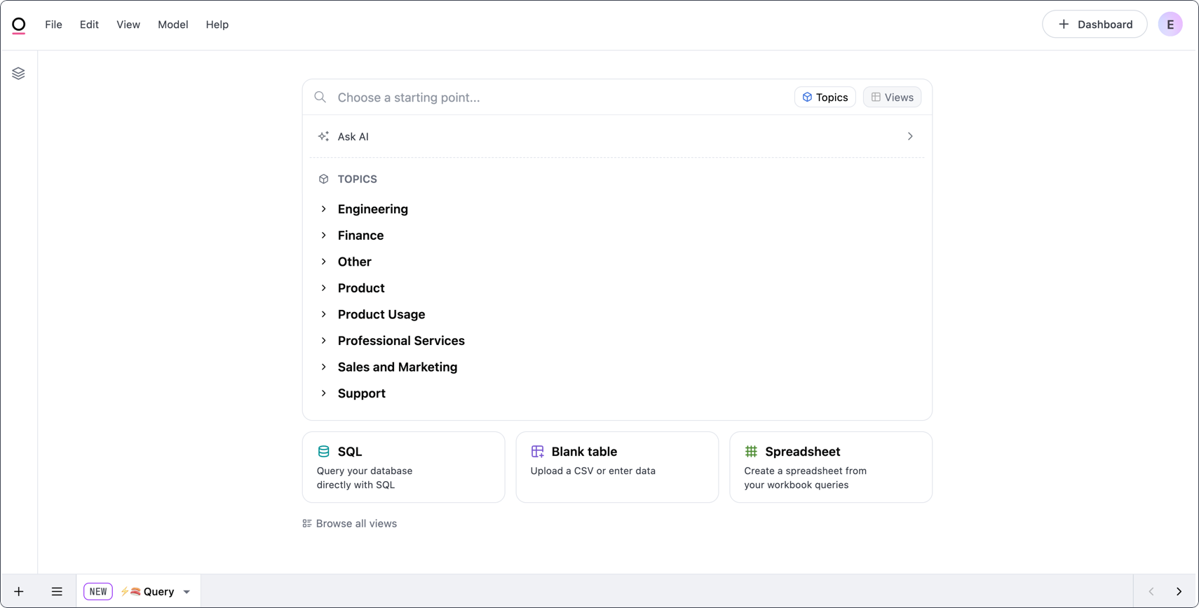 When you create a workbook or add a new query tab, you'll be prompted to select a starting point for the query. The Topics view will display the topics you have access to in the model that the workbook is based on.
