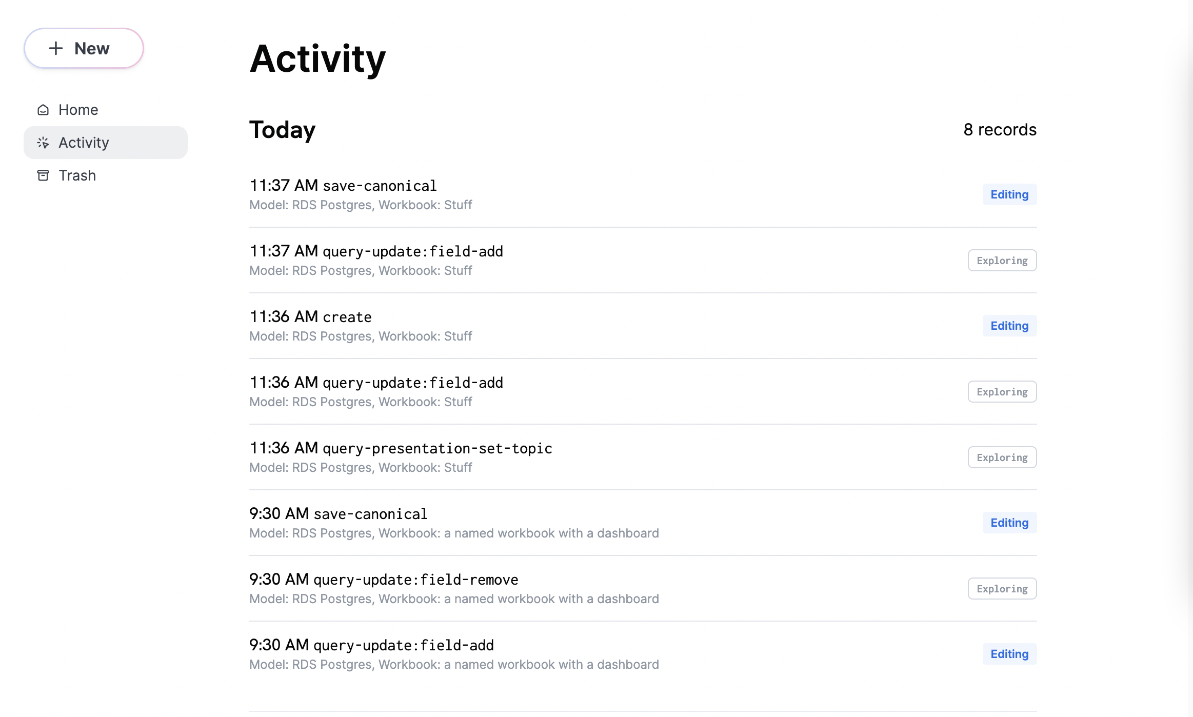 If a workbook is not saved, you can still return to that analysis by searching for it in the Activity section, or via URL. The Activity page logs all of your activity, whether on saved or unsaved workbooks.