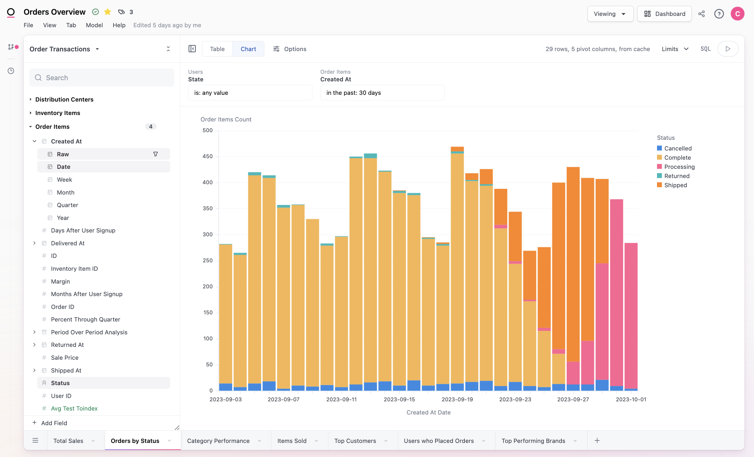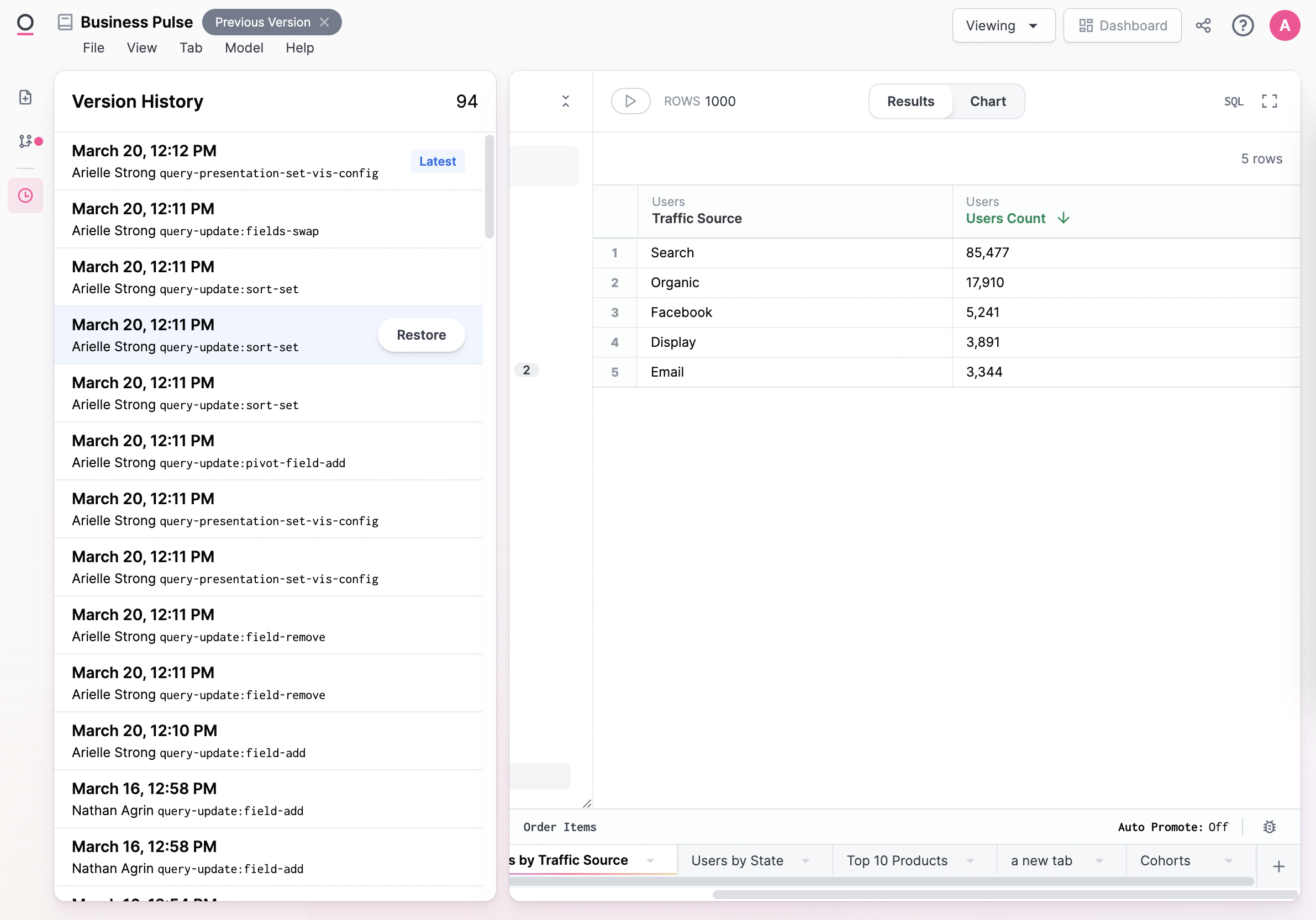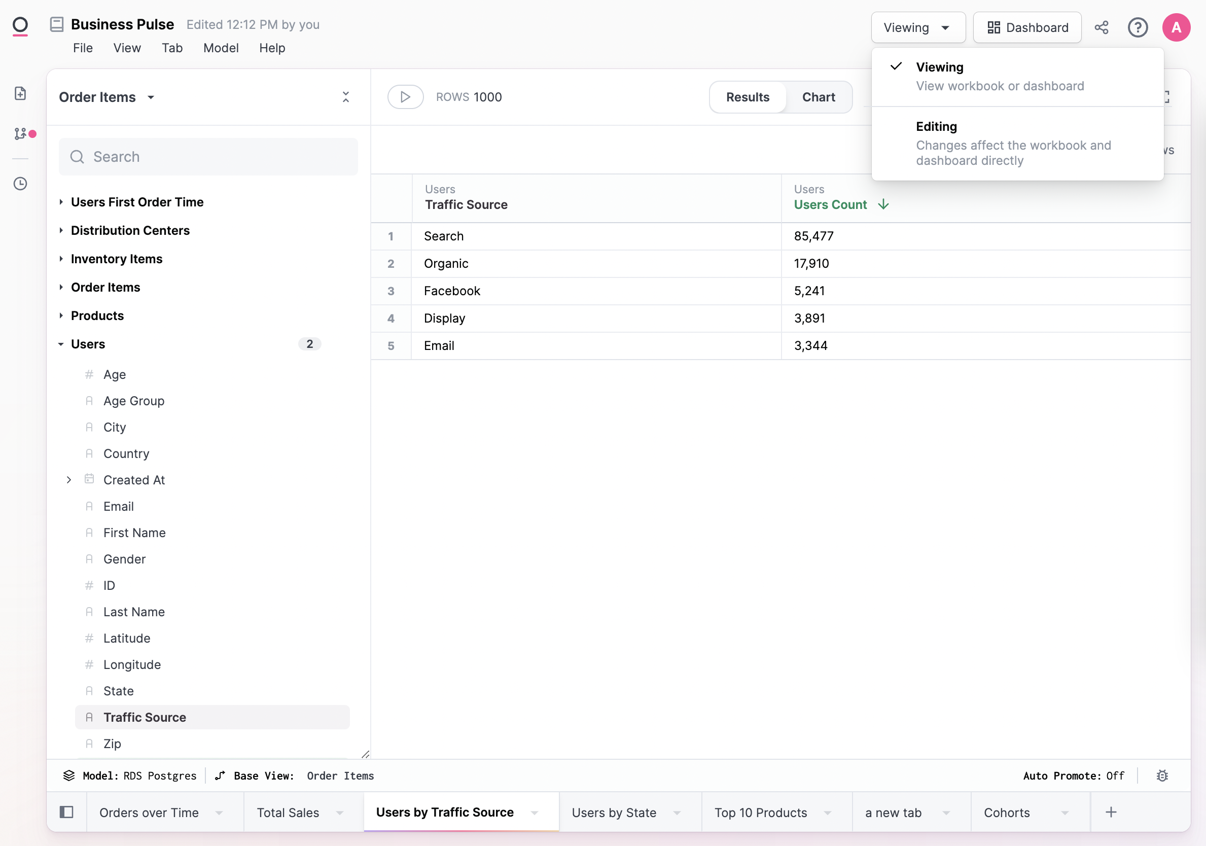 Omni's workbook UI is focused on asking any question of both modeled and un-modeled data in your databases. Each workbook contains one or more tabs, where data can be queried either using a UI-driven pivot-table experience or by writing SQL.