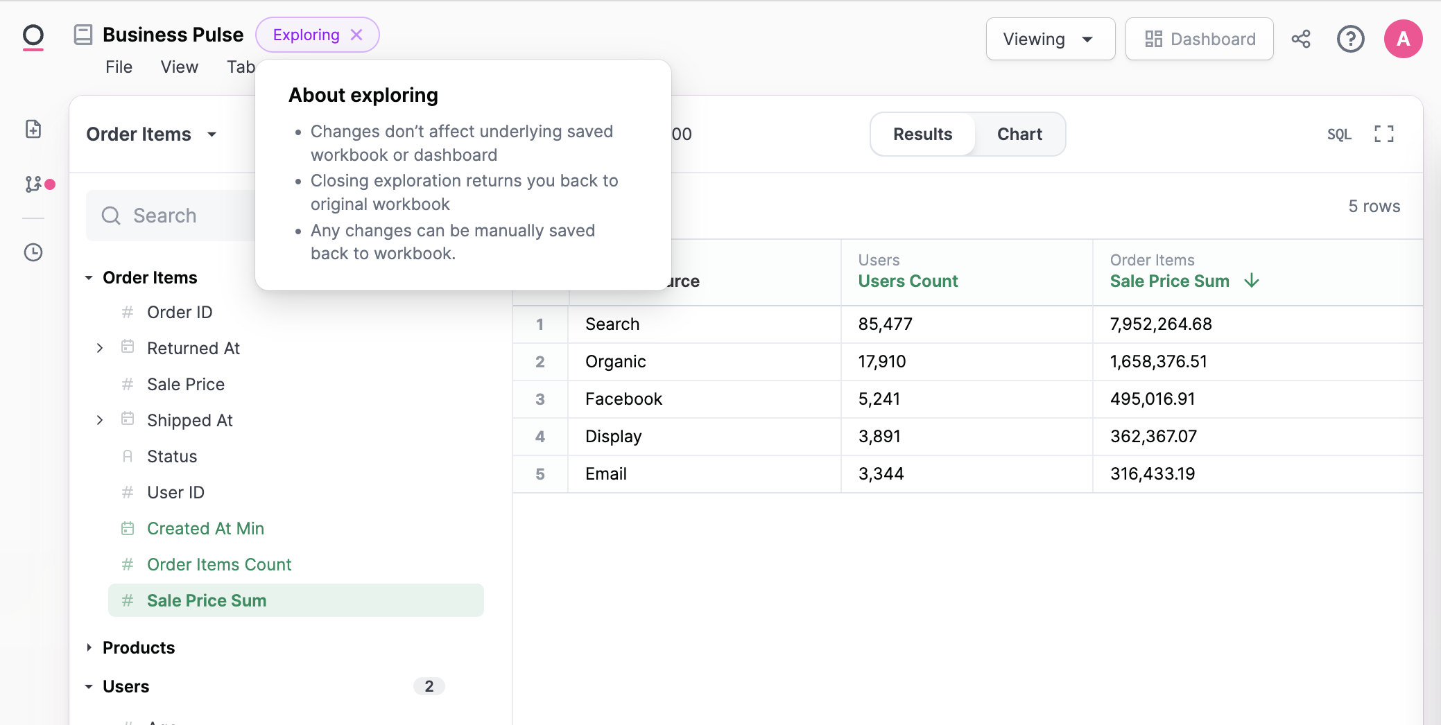 Sometimes you may want to explore or iterate on an analysis without impacting the saved version. From view mode, you can start interacting with the workbook to jump into an exploration.