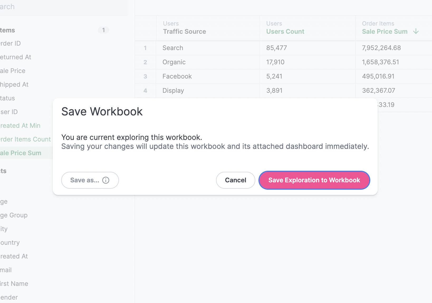 If you want to save your exploration, select Save from the file menu. This will add all current changes into the saved workbook.