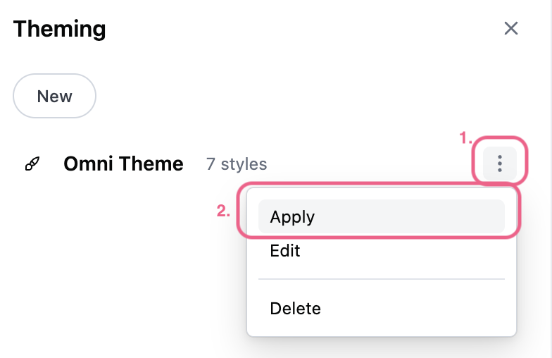 Once a theme is saved, it will appear in the Theming panel. Use the (three dots icon) to apply the theme to individual dashboards.