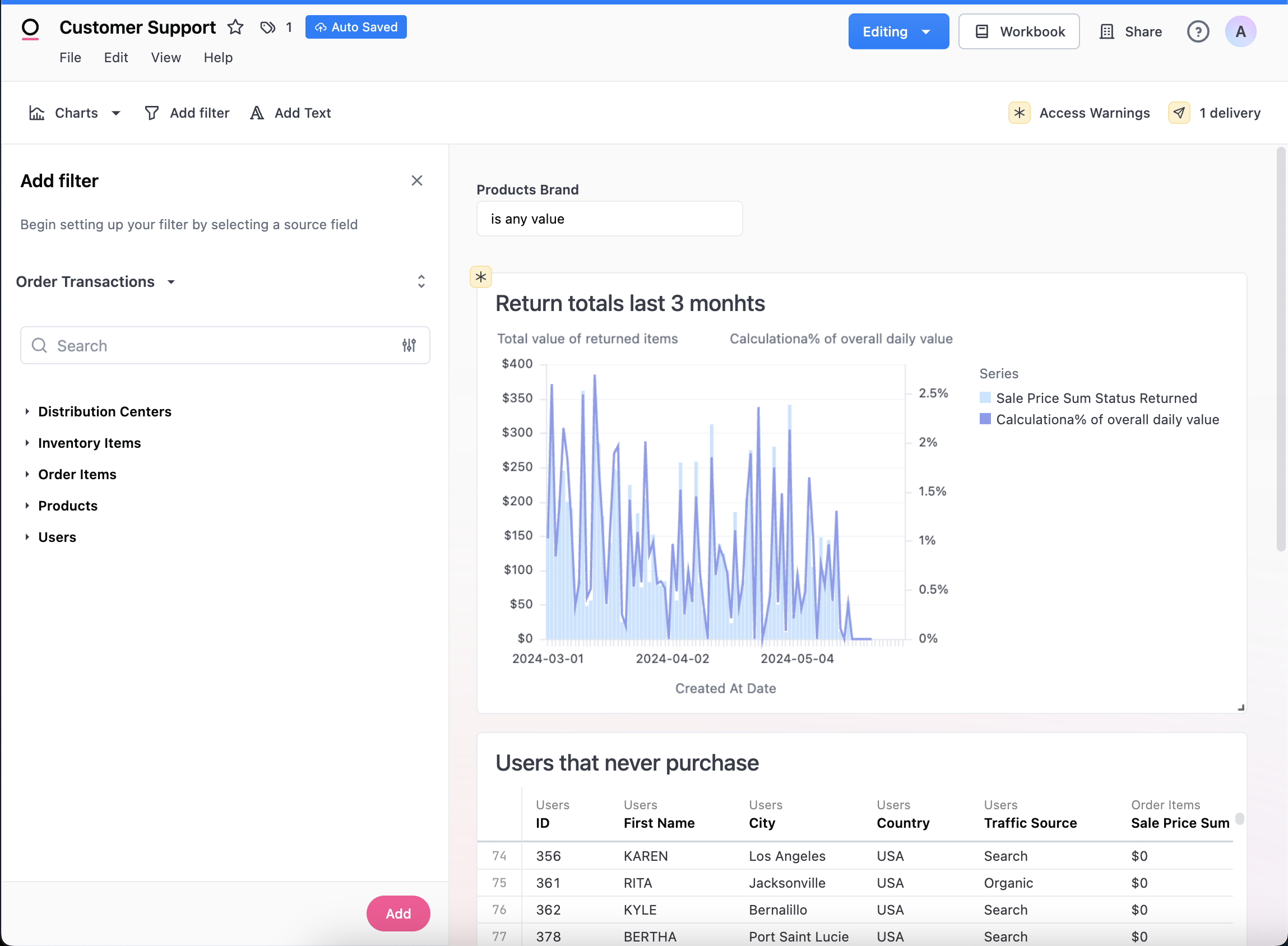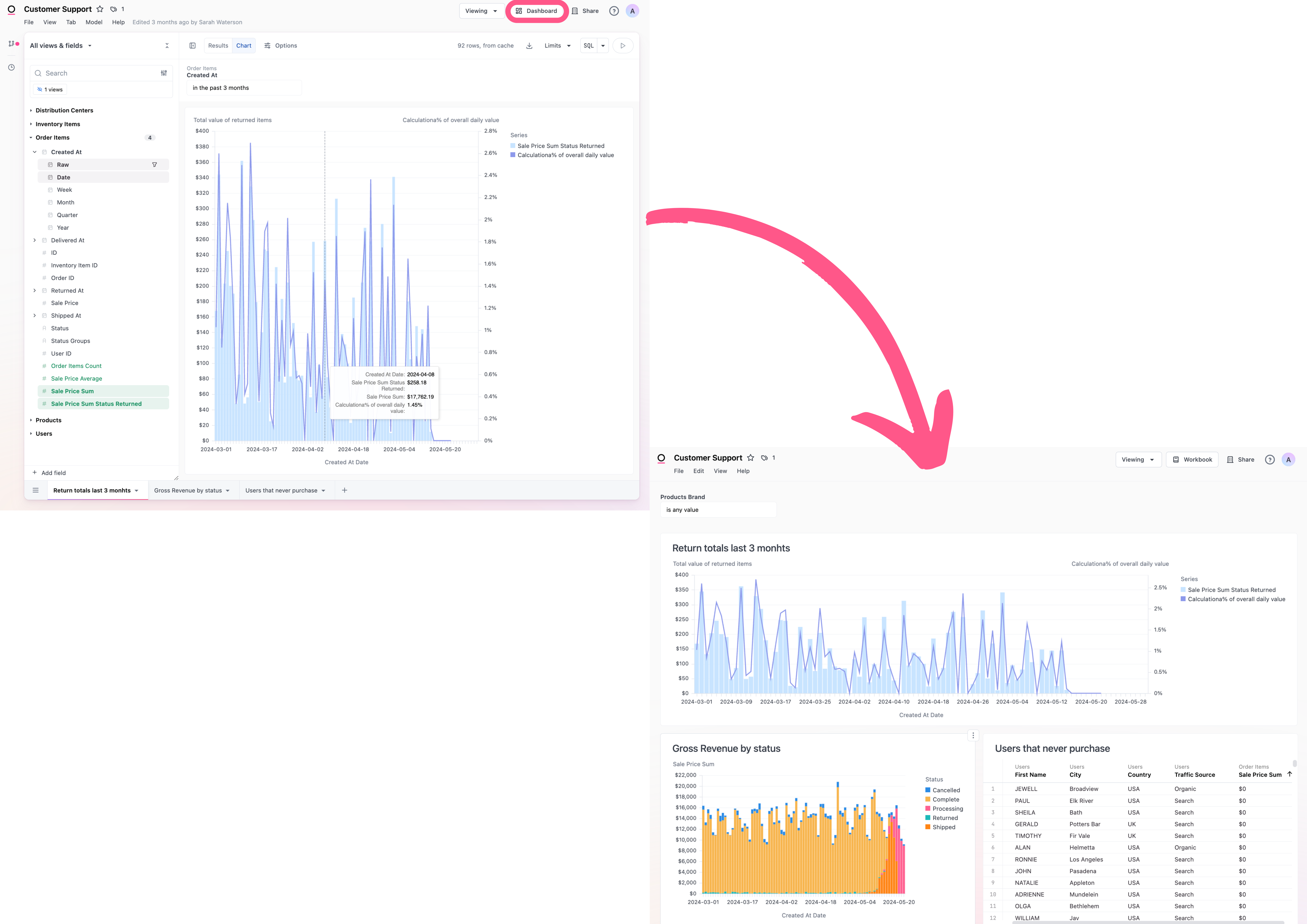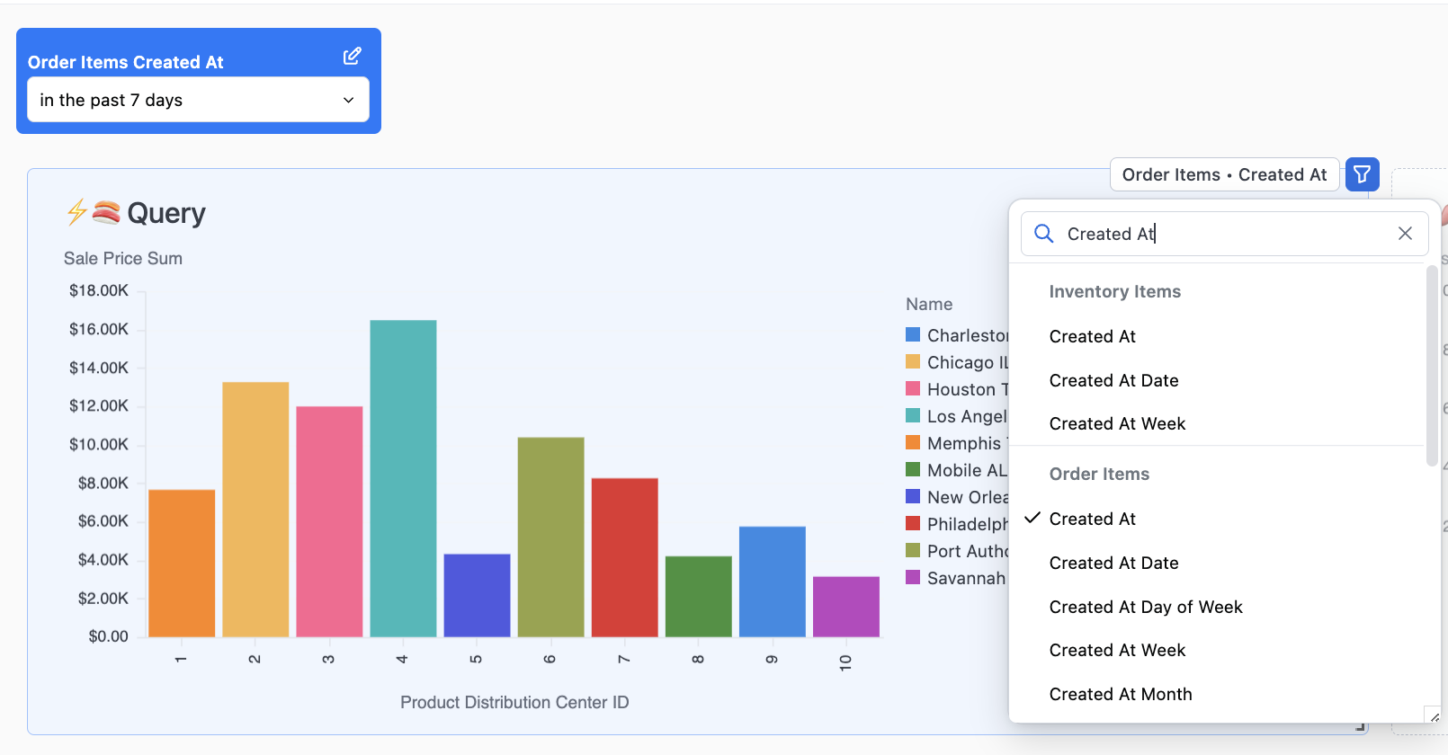 Filters can optionally be mapped to different fields on each tile. A common example is when you have a dashboard date filter, but want it to update a different date field on each tile (e.g. the users tile uses user_created_at and the orders tile uses orders_created_at). To configure, edit the filter then on the top right of each tile, select the field you want to map the filter to.
