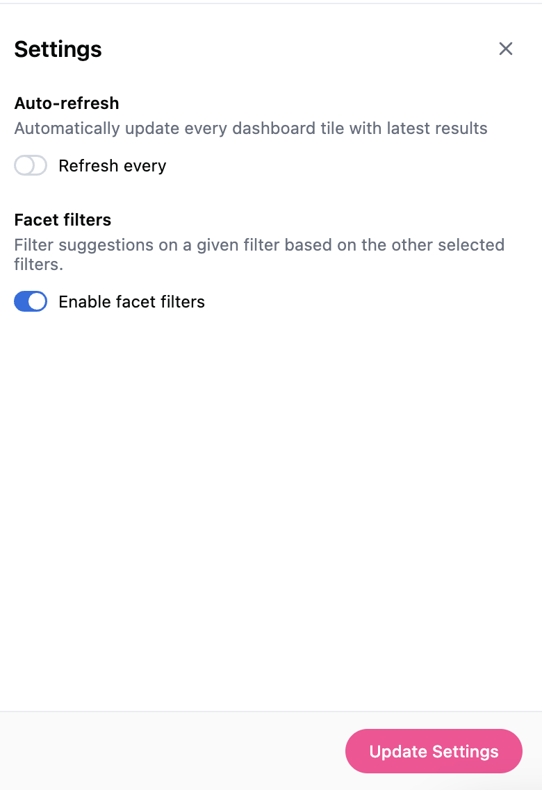 There are two dashboard settings available under the Edit menu: Auto-refresh and Facet filters.