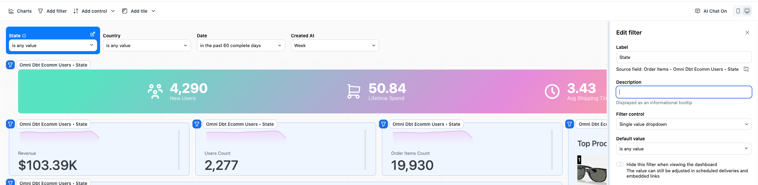 To hide a filter, toggle the Hide this filter when viewing the dashboard to on. The filter value will still be applied to the tiles that use the filter. The value of the filter can also be manipulated via the dashboard's URL, but ultimately the control is hidden from the user.