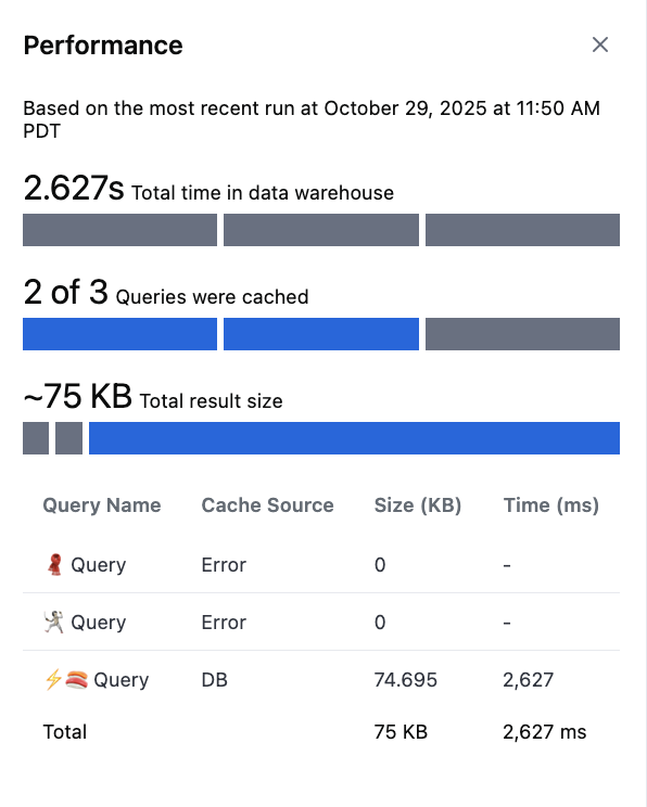 The Performance Profiler helps you analyze how a dashboard executes queries and identify potential performance bottlenecks. It shows whether tiles are served from cache or the data warehouse, how long queries take, and how much data they return. This view is useful for optimizing dashboard responsiveness and warehouse efficiency.