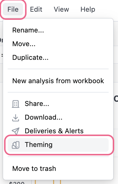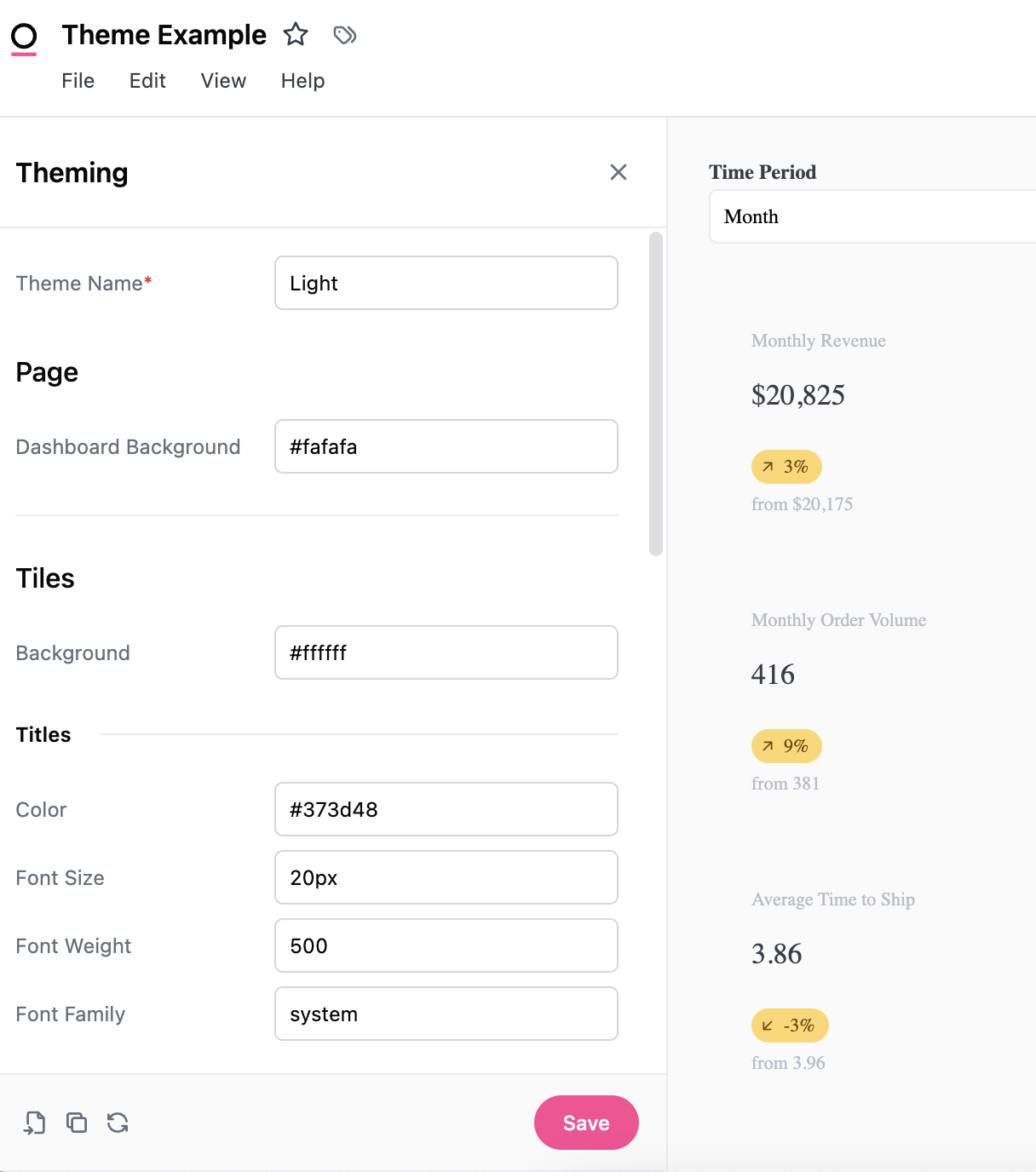 Omni Admins can create dashboard themes to customize the look and feel of dashboards. Once a theme is created, it can be reused on any dashboard. For internal dashboards it is available under File > Theming and for embedded dashboards it is available as a URL parameter.