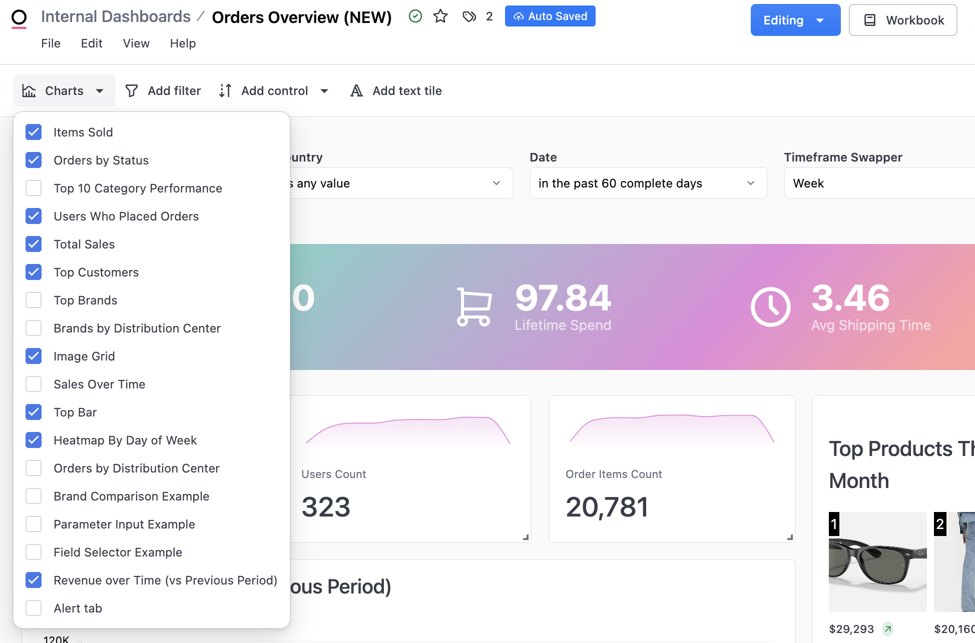 Controls allow you to choose which fields will be shown in a tile. To add a control to the dashboard, go into edit mode and select Add Control. Configuring a control asks that you start by picking one of the underlying fields common to the tiles you want to control, including schema and view name. Otherwise the control will have no impact (e.g. adding a field switcher between ${order_items.order_volume} and ${order_items.total_sales} to a tile that is showing ${users.user_count} will have no impact).