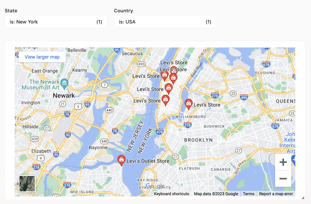 <iframe src="https://www.google.com/maps/embed/v1/search?q={{result.0.products.brand.value_static}}