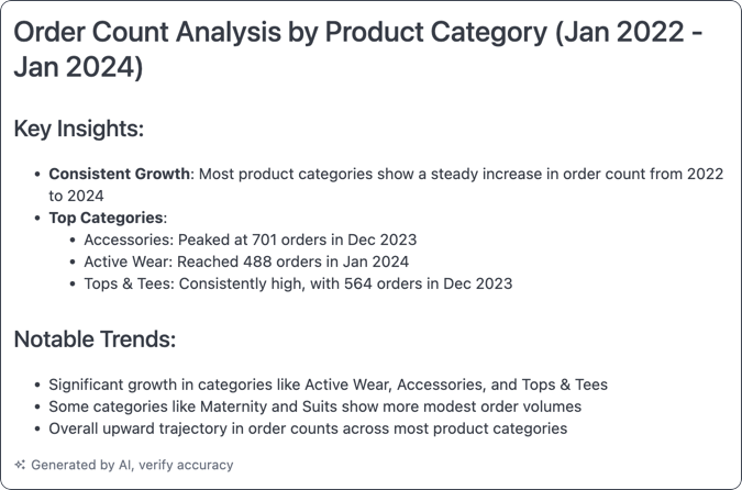 - Include calculations and totals in the query if you want the summary to reference them. This approach will provide better results over relying on the AI for calculations in the summary itself.