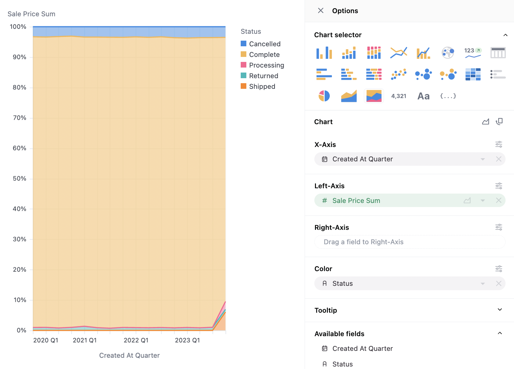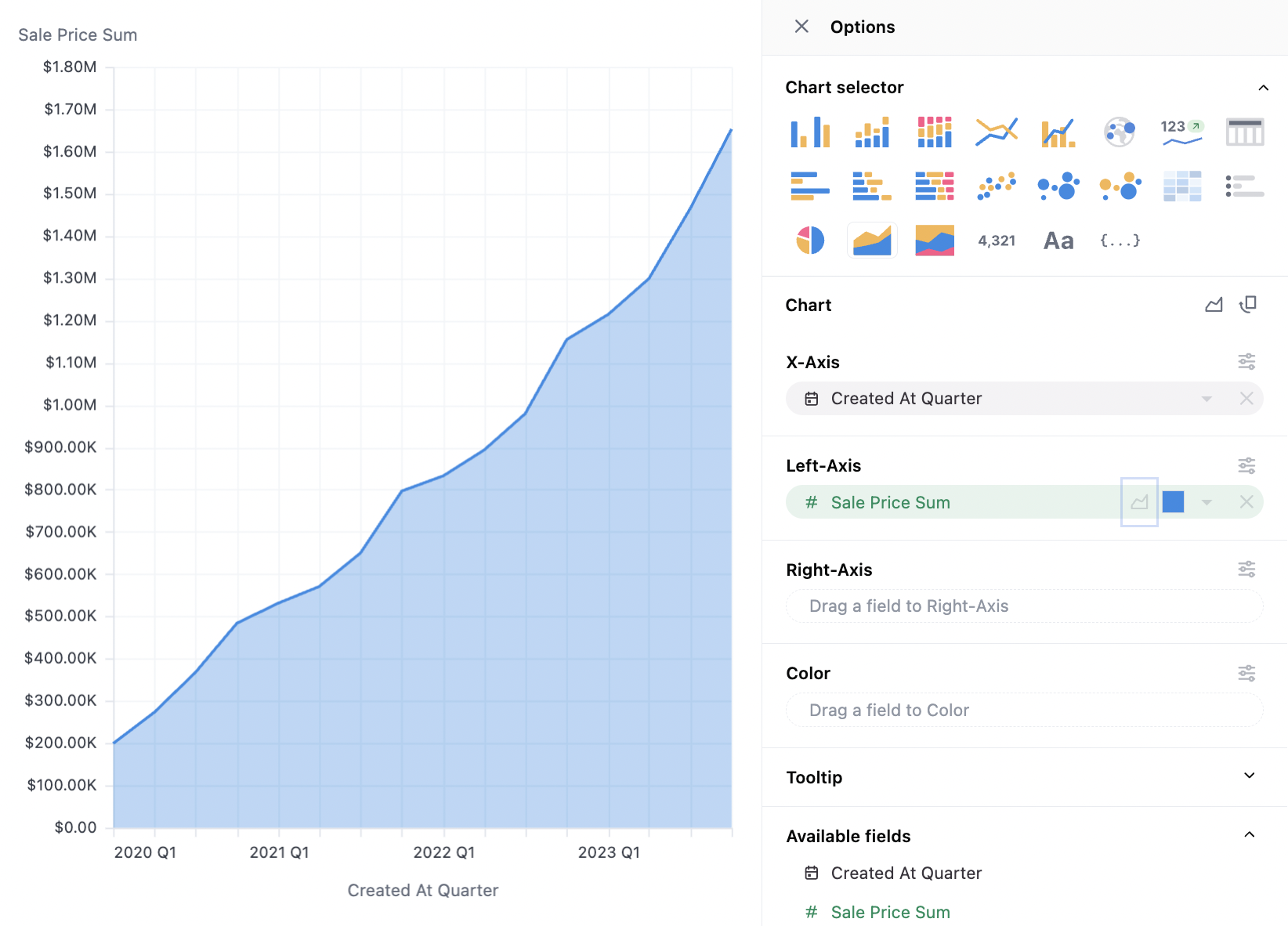 - Time dimension axes are set to temporal with area charts, meaning points will be displayed along a continuous time axis. For charts where ordinal behavior is desired, it's recommended to toggle the individual series from a bar chart accelerator.