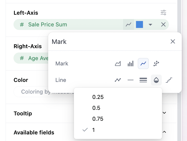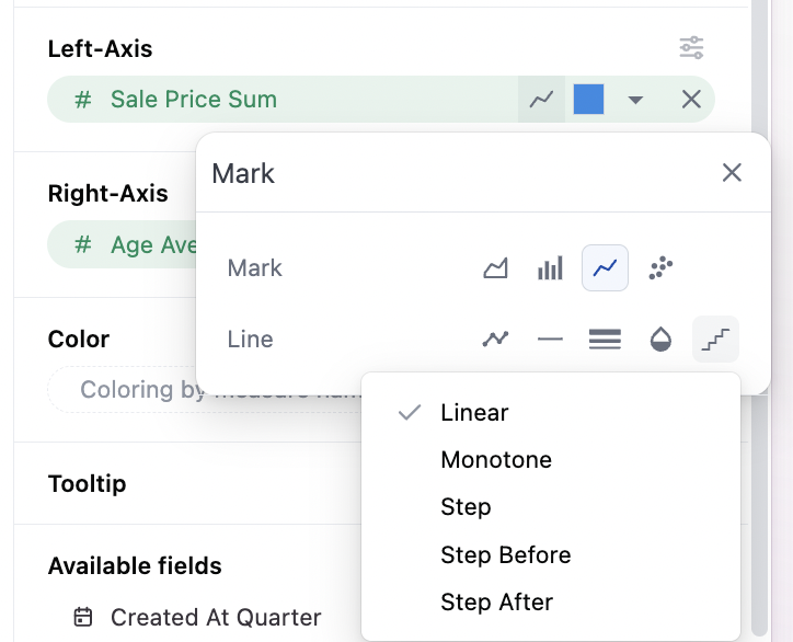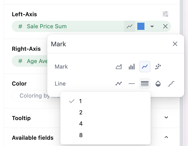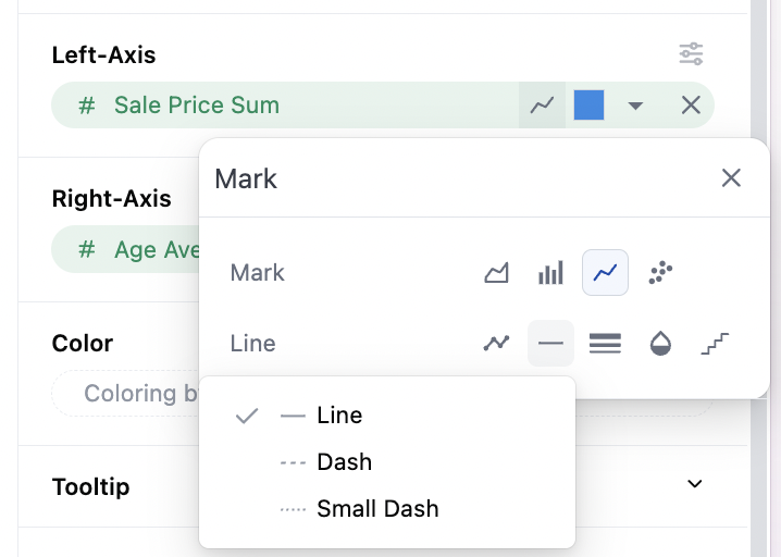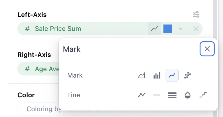 The mark selector at the top of the configuration sets the global chart configuration (configuration across all series). Note that each series can be set independently to bar, line, scatter, area independently under their y-axis controls