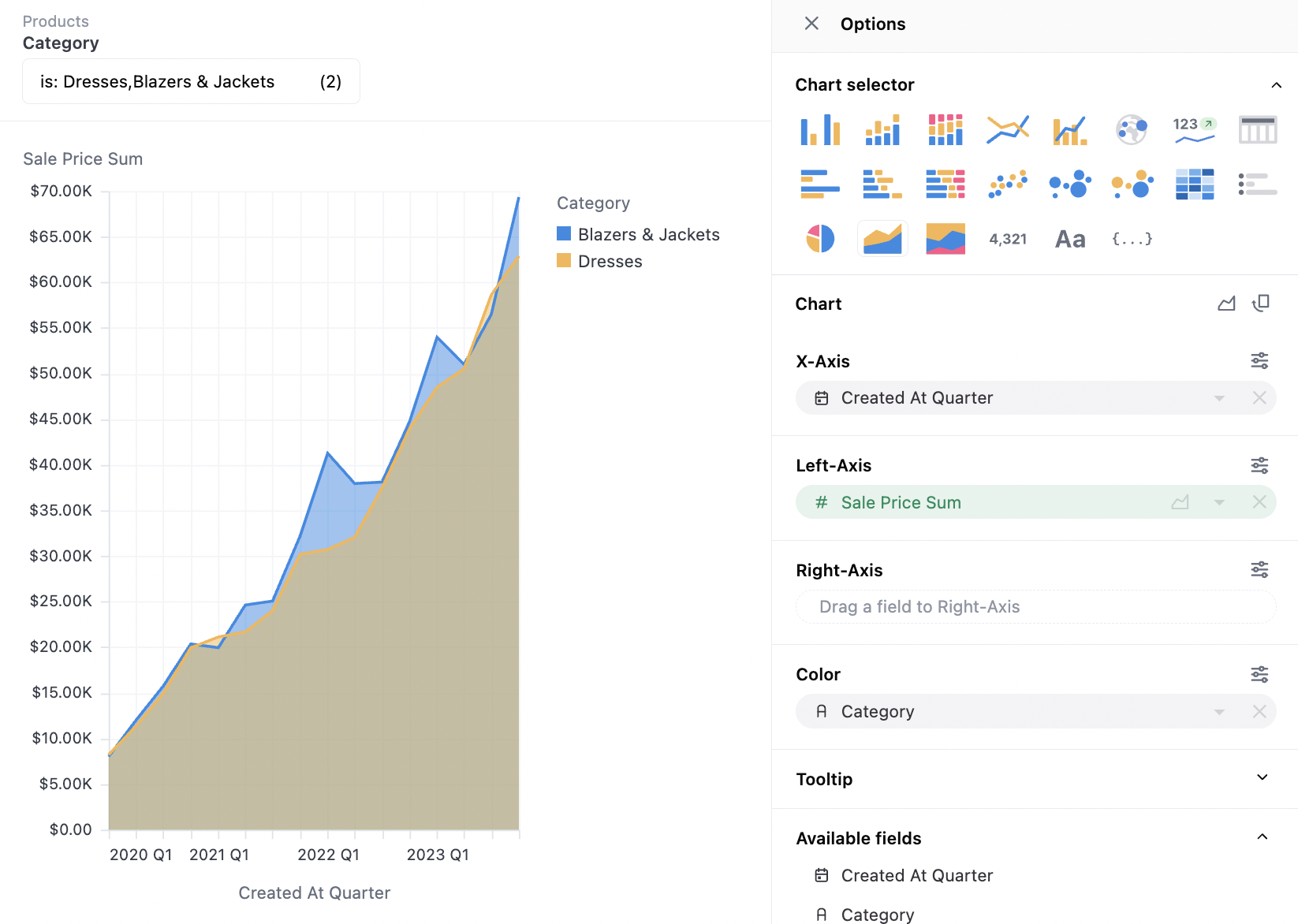 Area charts can work with pivoted or unpivoted data, using 2 dimensions and one measure. To stack or group a chart, one series should be moved to the color facet.