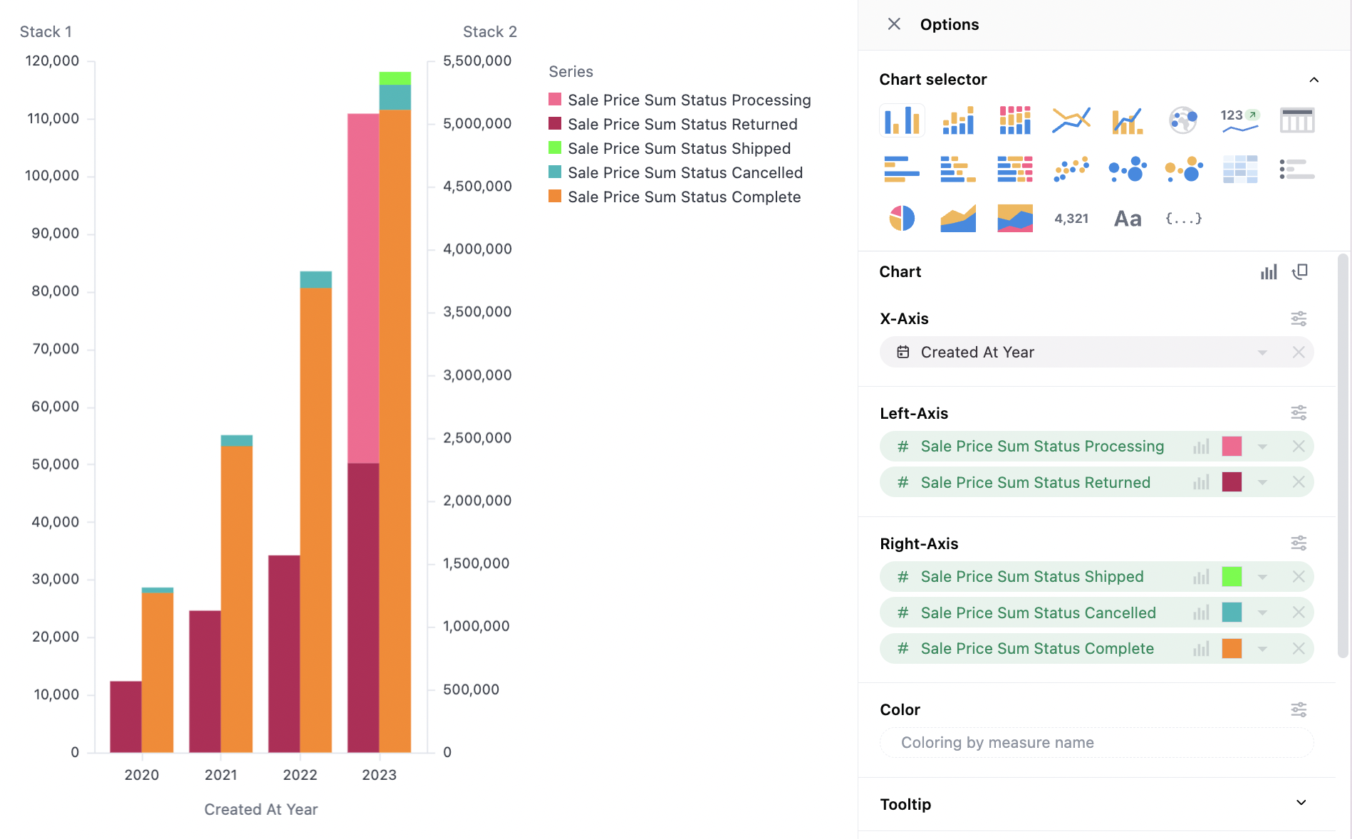 The color section controls overall stacking and grouping behavior overall. Additionally stack can be set independently on the different y-axis, under the y-axis series configuration (useful for overall grouping of two stacked grouplets):